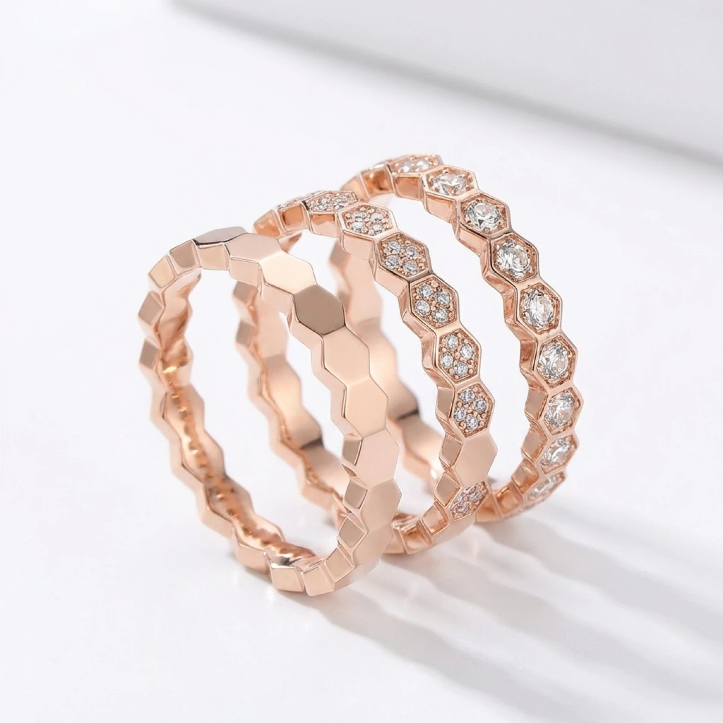 A set of three stackable rings in a rose gold finish, each with a unique design. One ring features a honeycomb pattern, another has clear crystals set in a geometric design, and the third showcases a delicate heart pattern. These rings are made of metal and are sold in their original ChicStyle box.