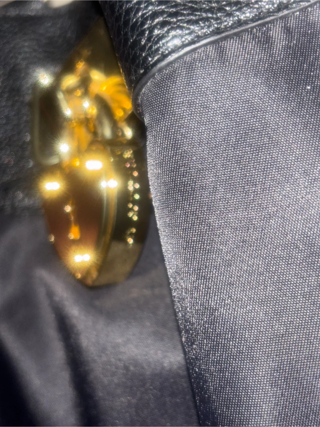 This Juicy Couture satchel bag is black with gold hardware accents. It's made from a mix of pebbled leather and fabric. This versatile bag comes with both top handles and a detachable shoulder strap.