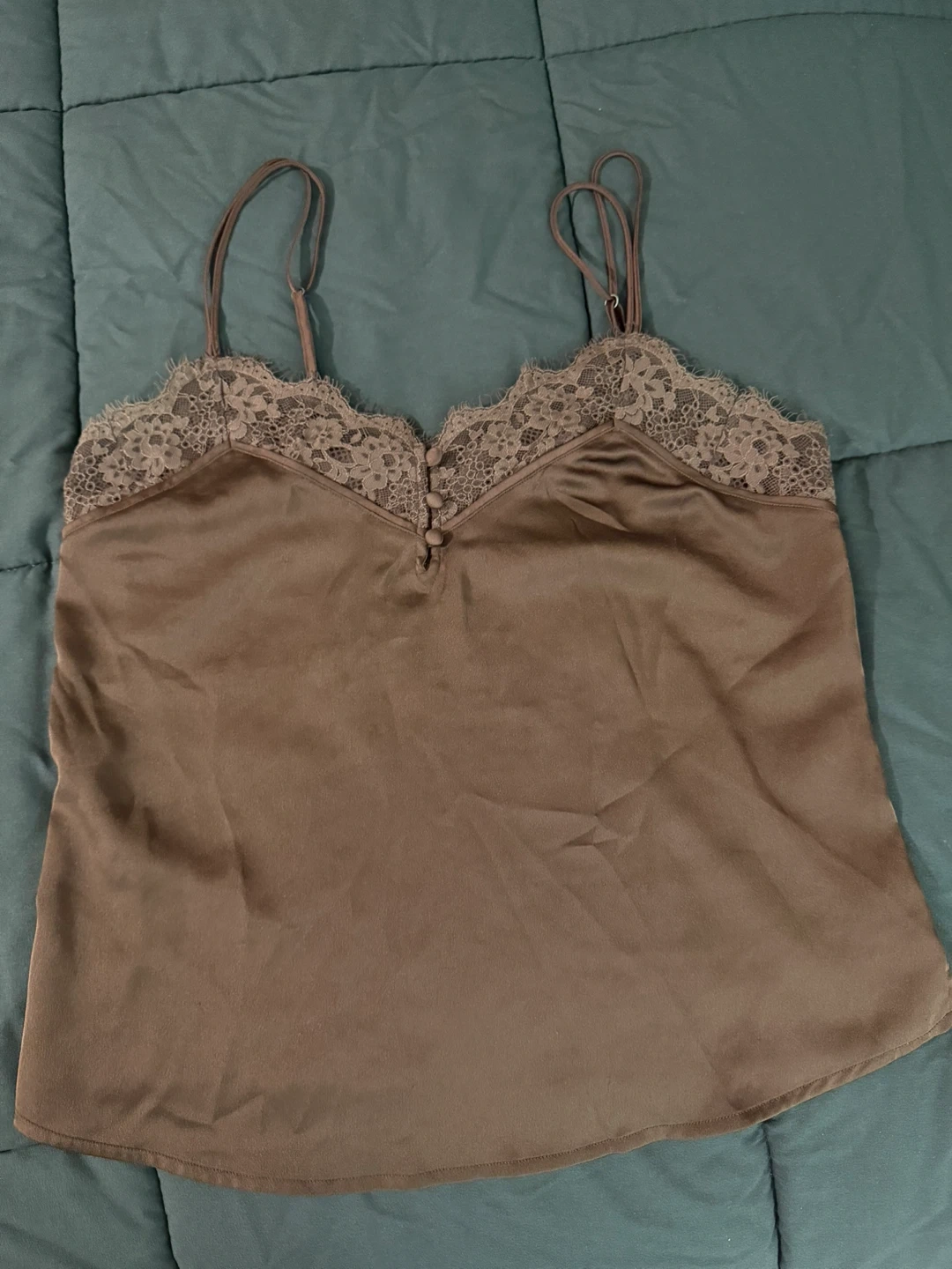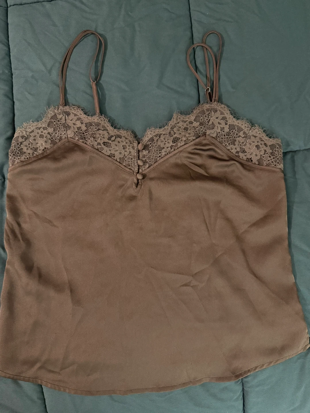 This is a stylish brown camisole made from a satin-like material. It features delicate lace detailing along the neckline and adjustable spaghetti straps. Two small buttons are visible at the front.
