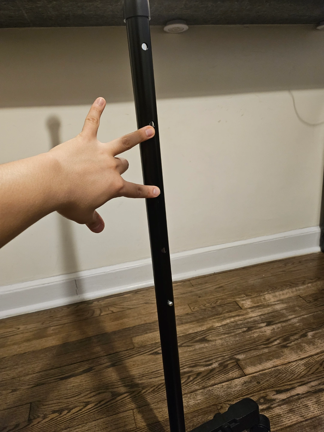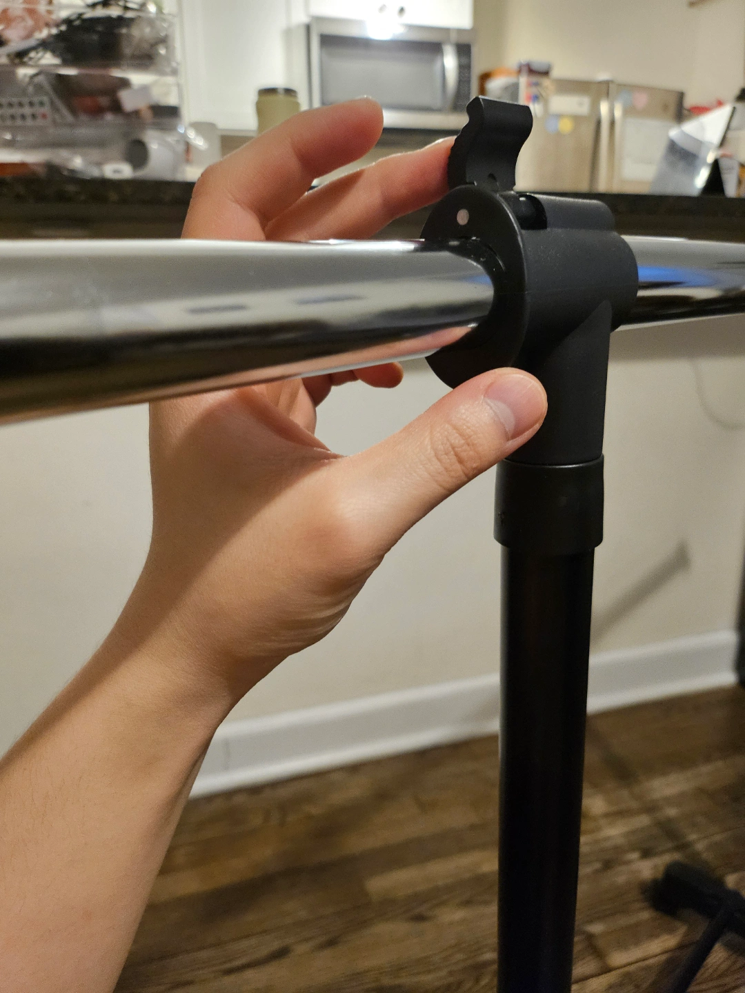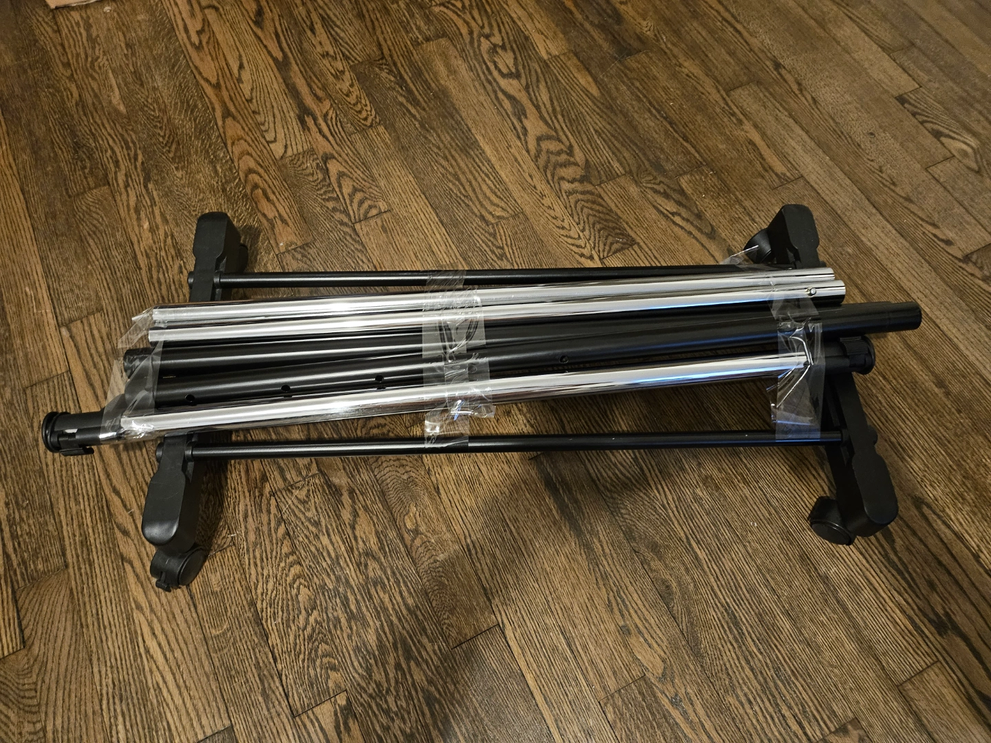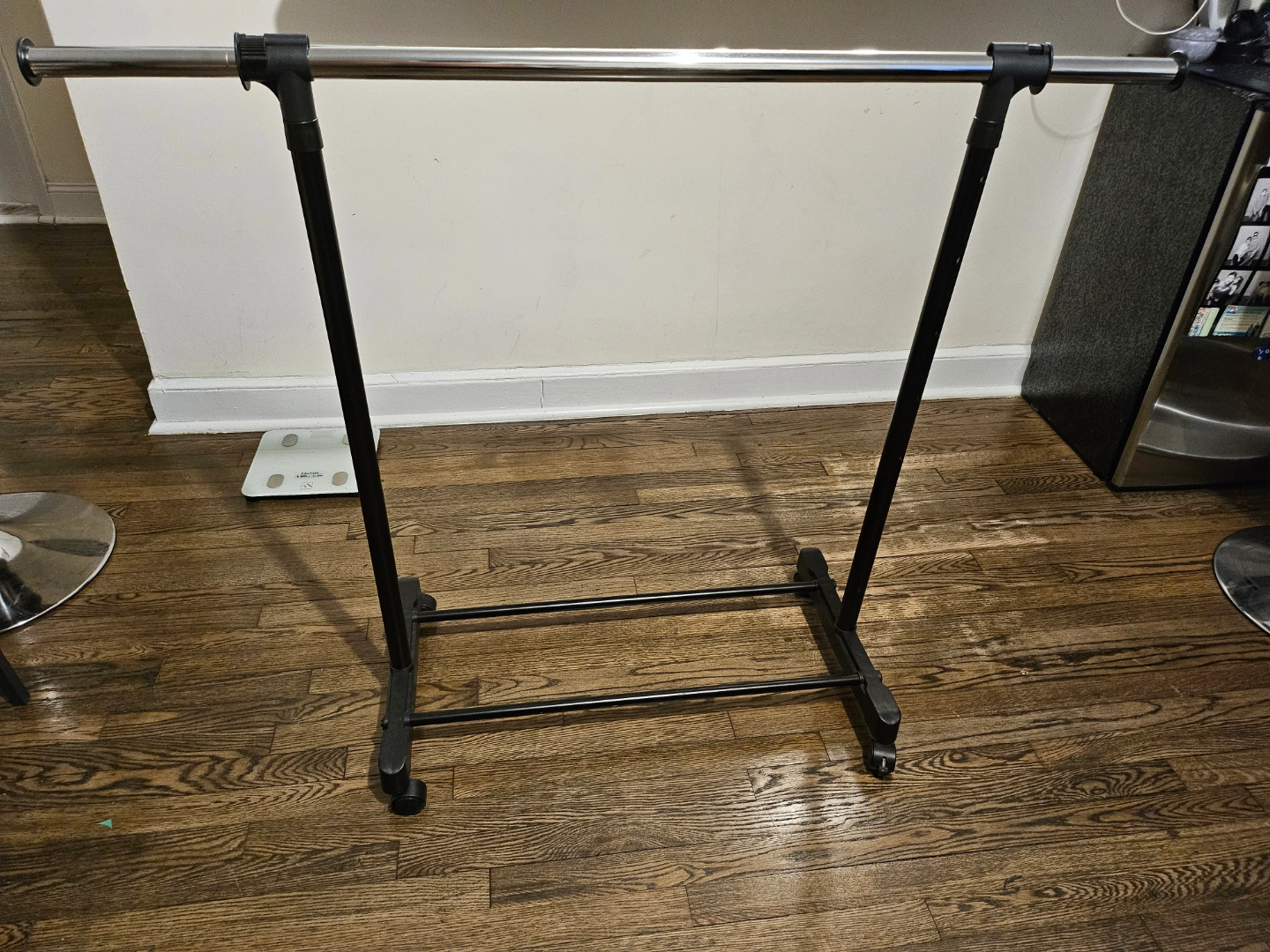 Adjustable height clothing rack. Black metal frame. Chrome rod. Four rolling wheels. Easy assembly. Great for small spaces.