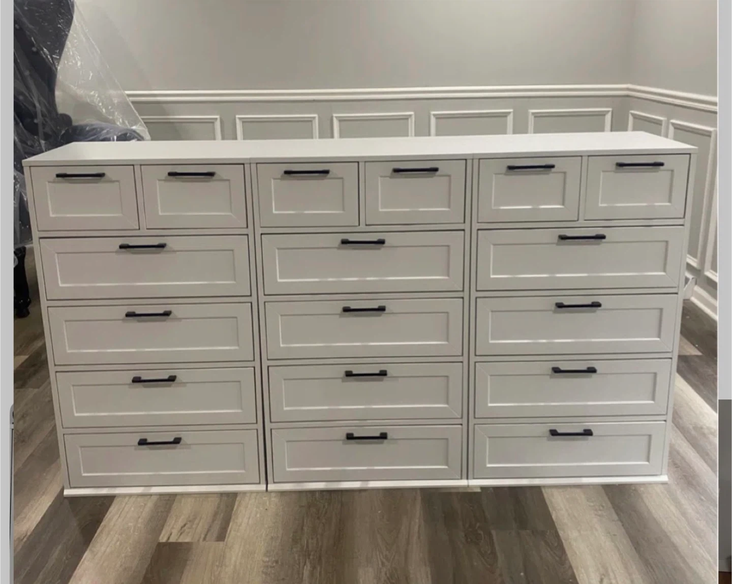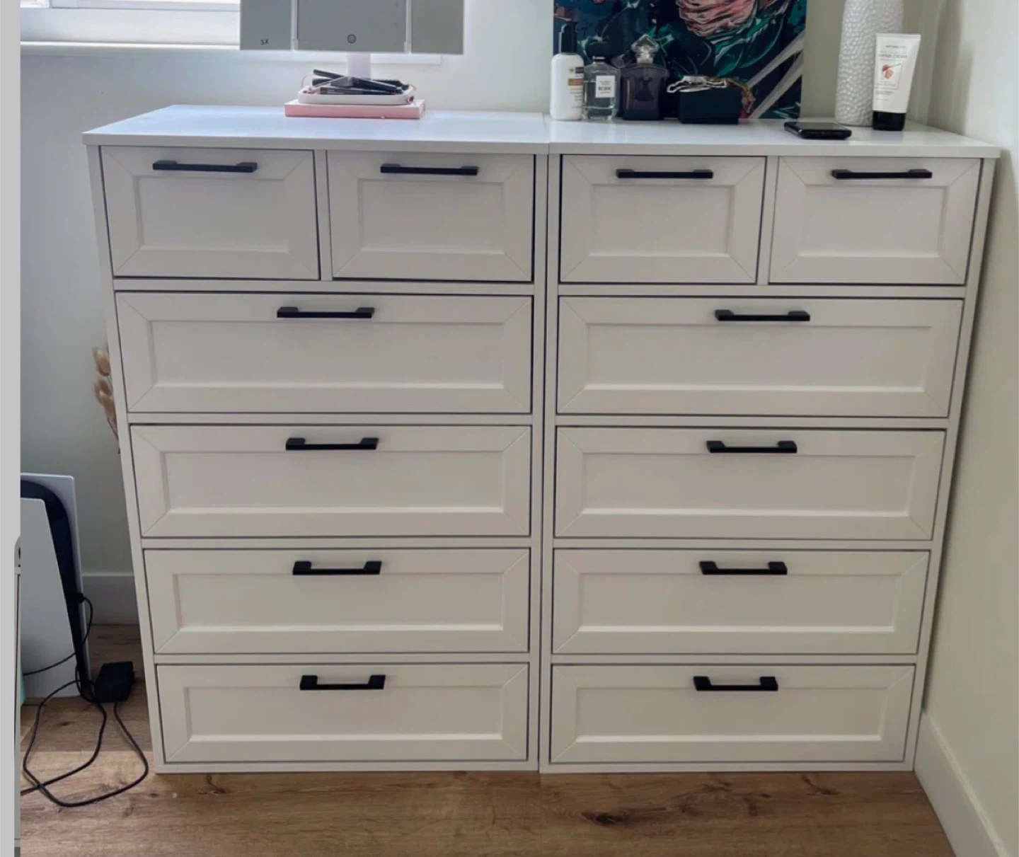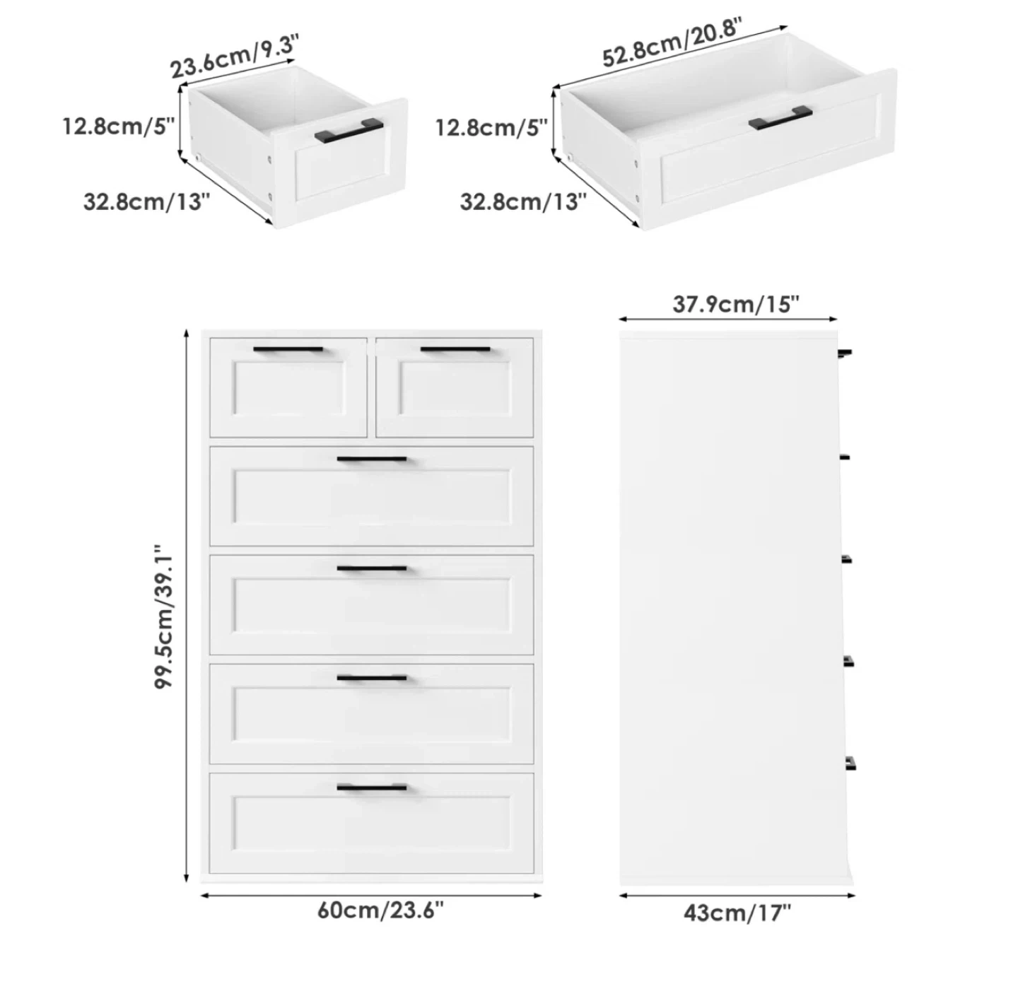 This dresser has a clean white finish with black handles. It's a modular unit, perfect for organizing clothes or other household items. The dimensions are 60cm (width) x 43cm (depth) x 99.5cm (height).