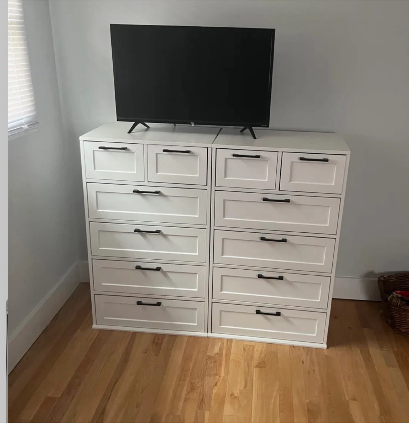 This dresser has a clean white finish with black handles. It's a modular unit, perfect for organizing clothes or other household items. The dimensions are 60cm (width) x 43cm (depth) x 99.5cm (height).