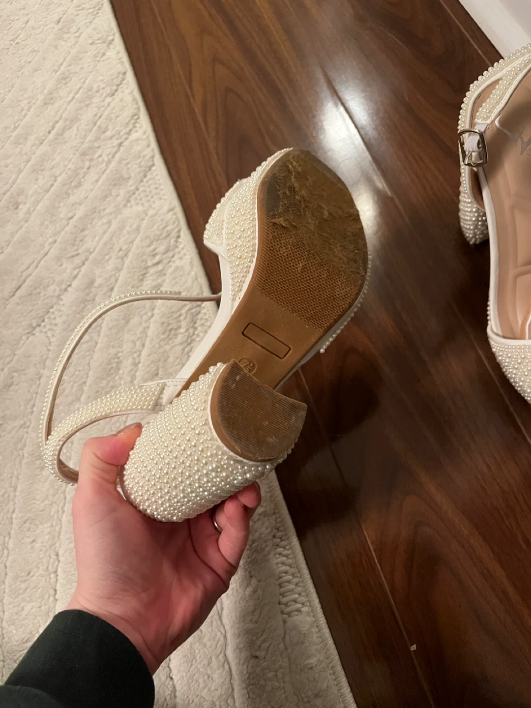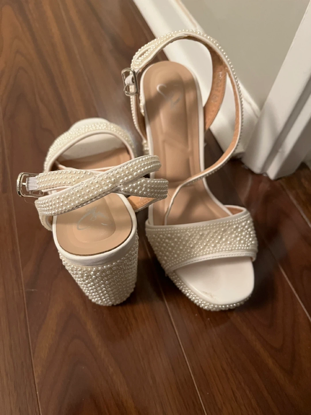 Windsor women's heeled sandals in white. Size 7.5, used once for my bachelorette. These stylish heels are covered in pearls.