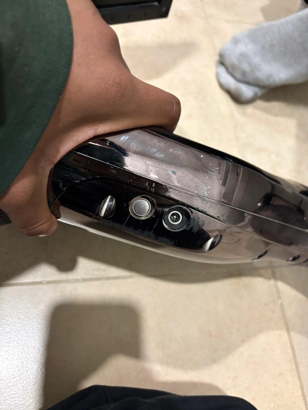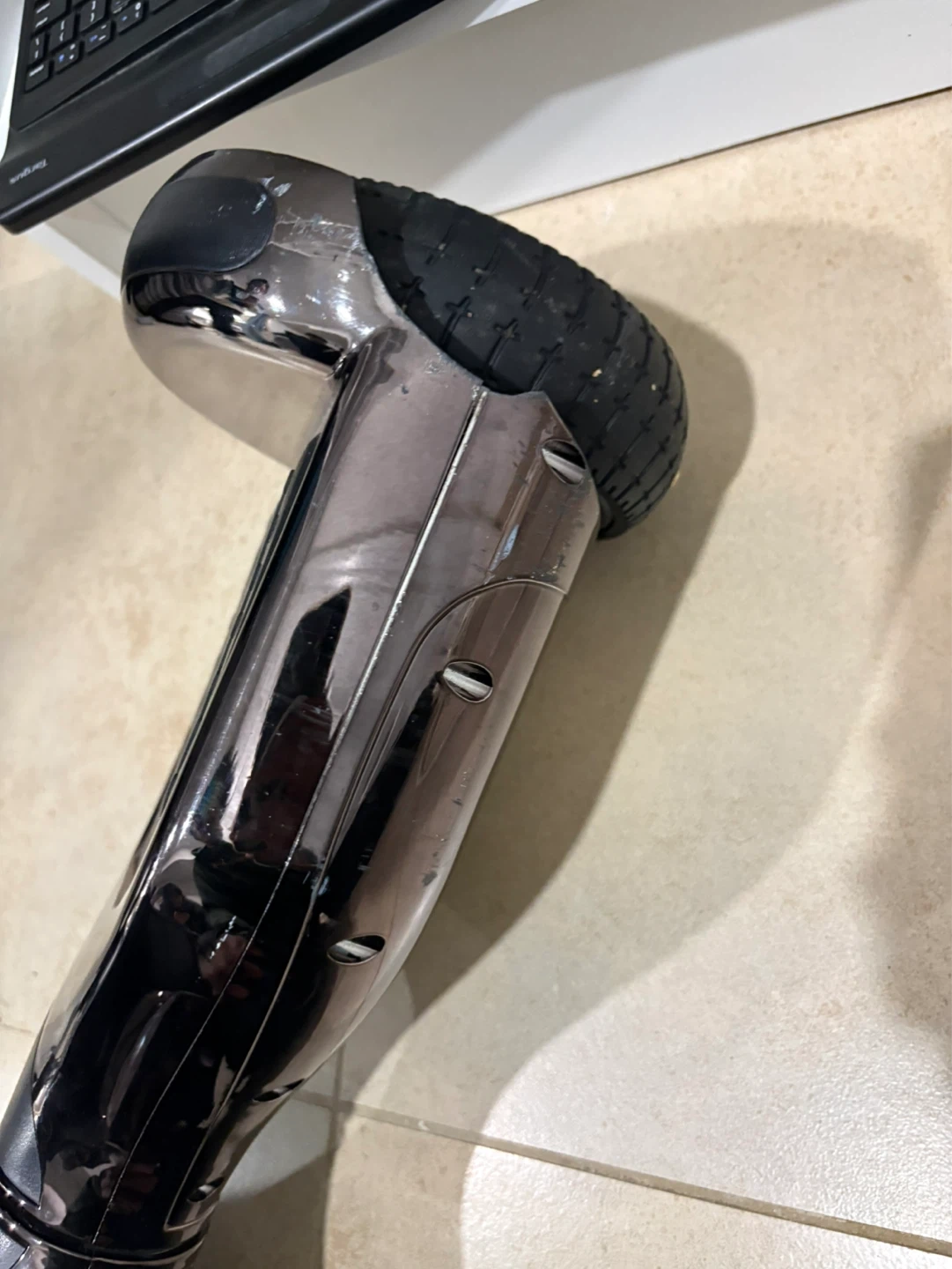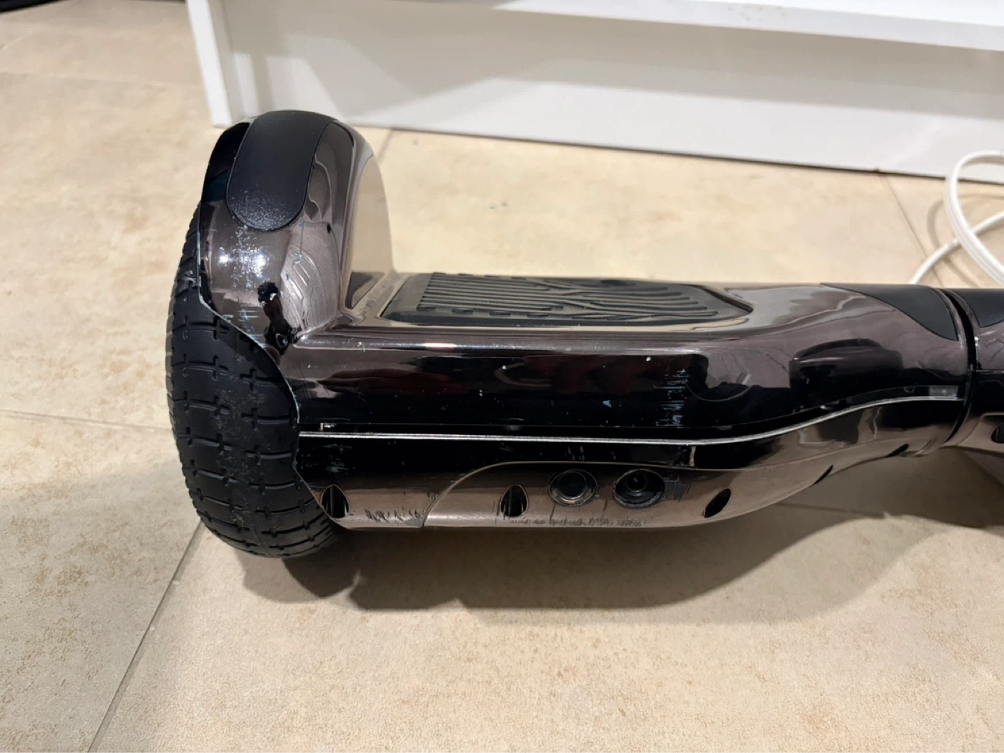 This is a chrome-finished hoverboard with black wheels and accents. Good for parts and possibly battery replacement. Doesn’t really work anymore just trying to get ride of it.