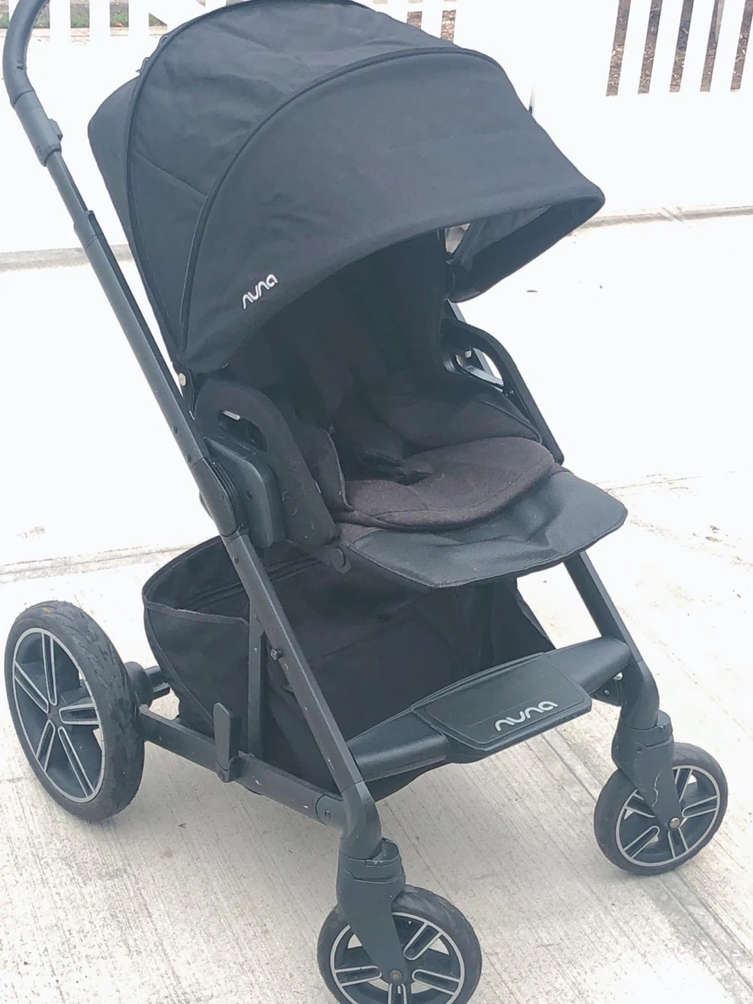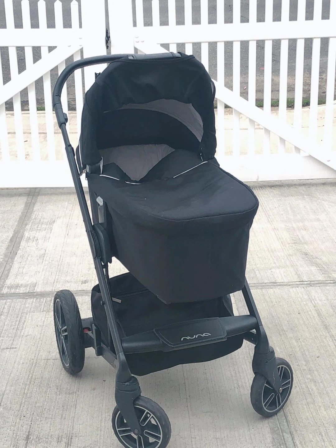 Black Nuna stroller. Features a reversible seat and a large storage basket. The canopy offers sun protection. Includes infant insert and bassinet attachment.