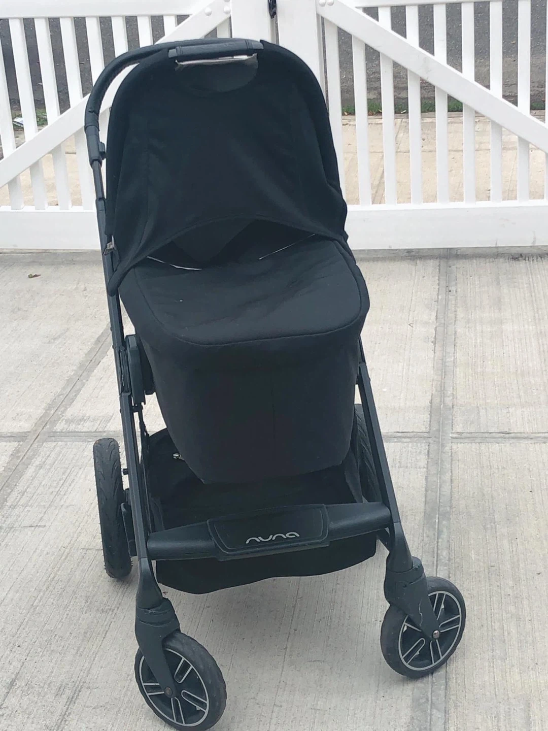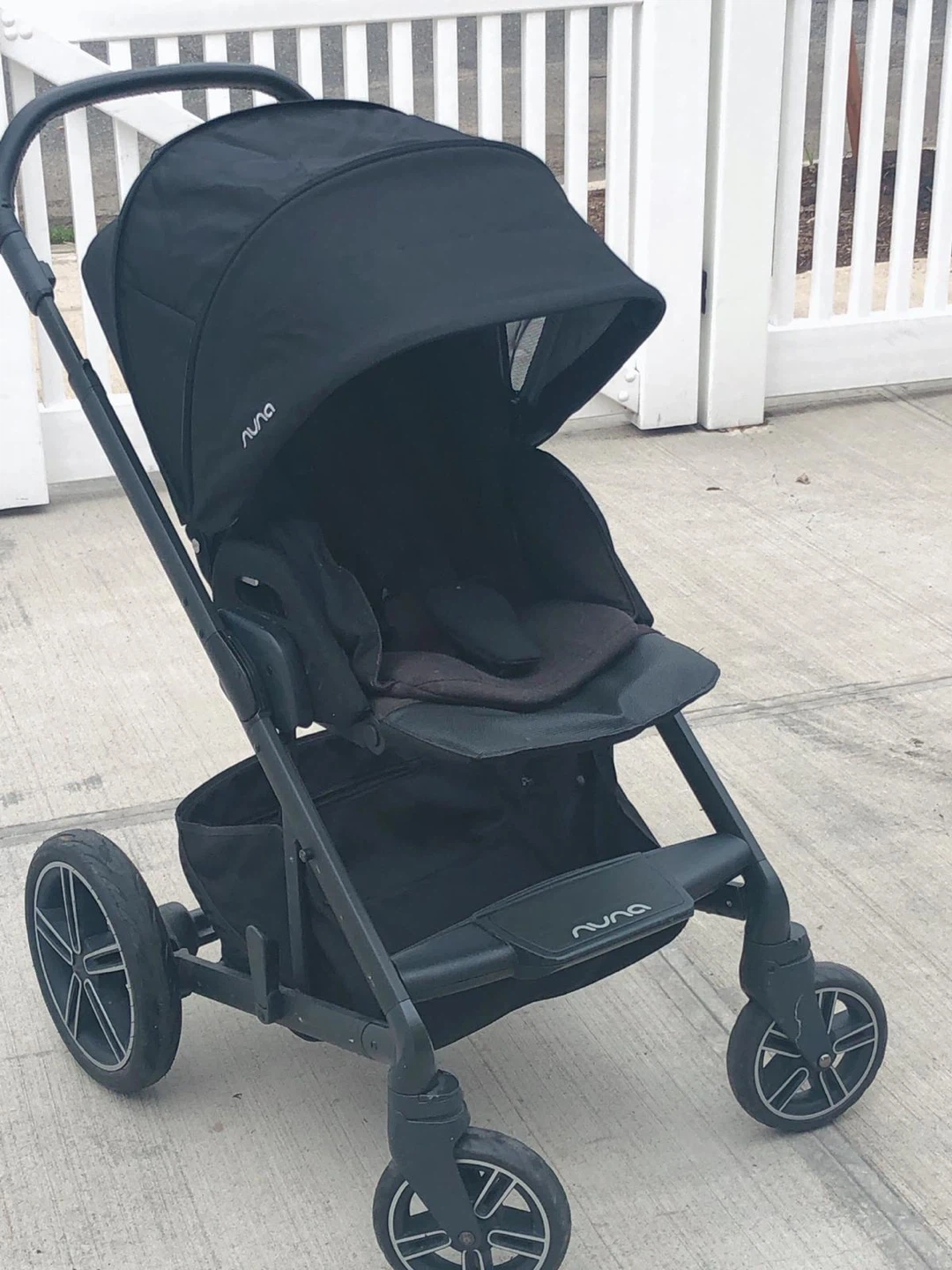 Black Nuna stroller. Features a reversible seat and a large storage basket. The canopy offers sun protection. Includes infant insert and bassinet attachment.
