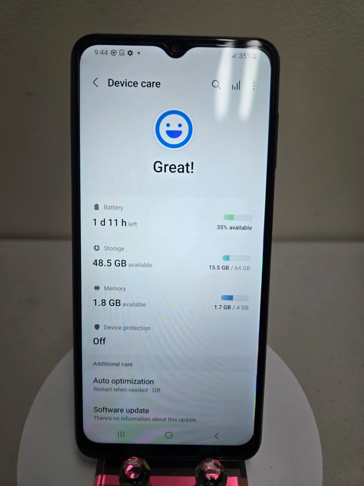 This is a black Samsung A136W smartphone. It has 64 GB of storage and 4 GB of RAM. The device care screen shows the battery has 1 day and 11 hours left.