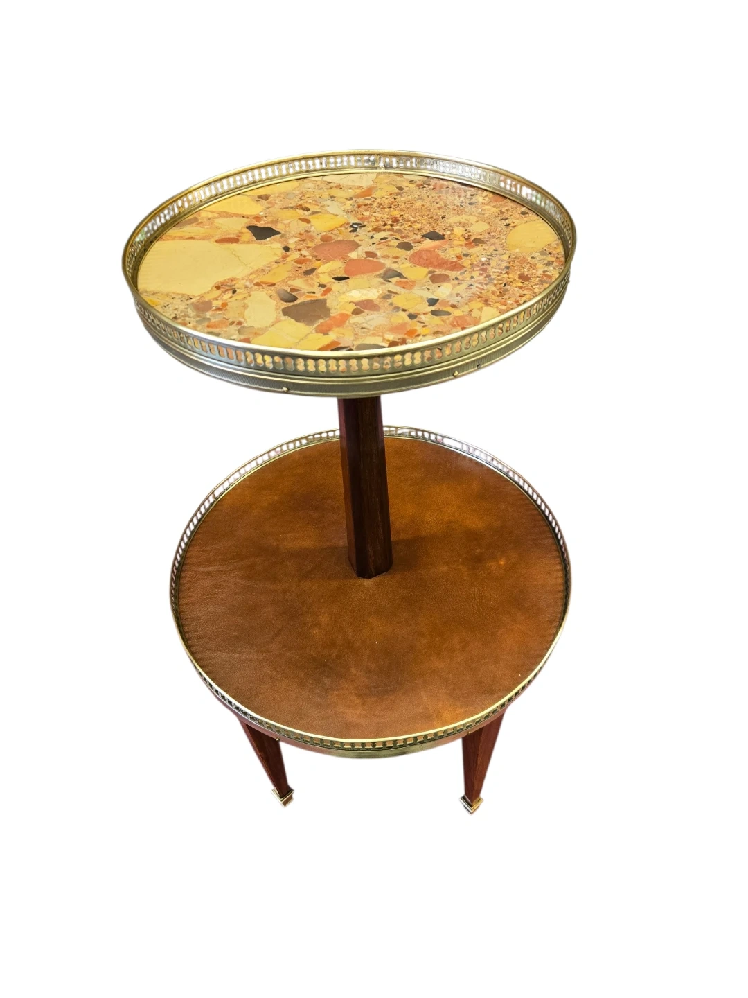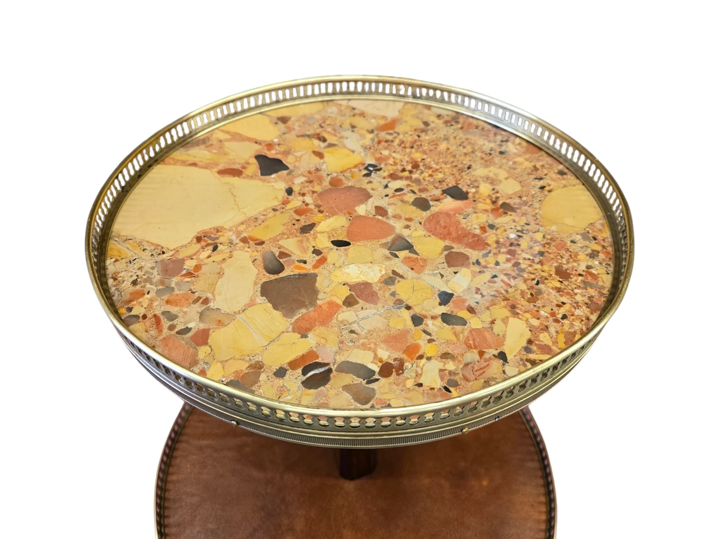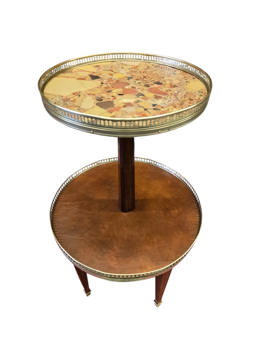 A charming two-tiered side table featuring a decorative terrazzo top shelf and a leatherette-covered lower shelf. The wooden stem and legs add a classic touch. This piece is perfect for displaying drinks or decorative items in any living space!