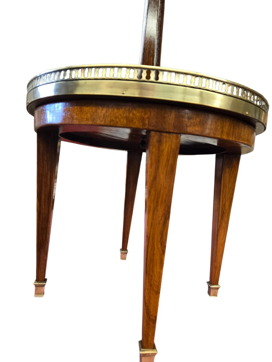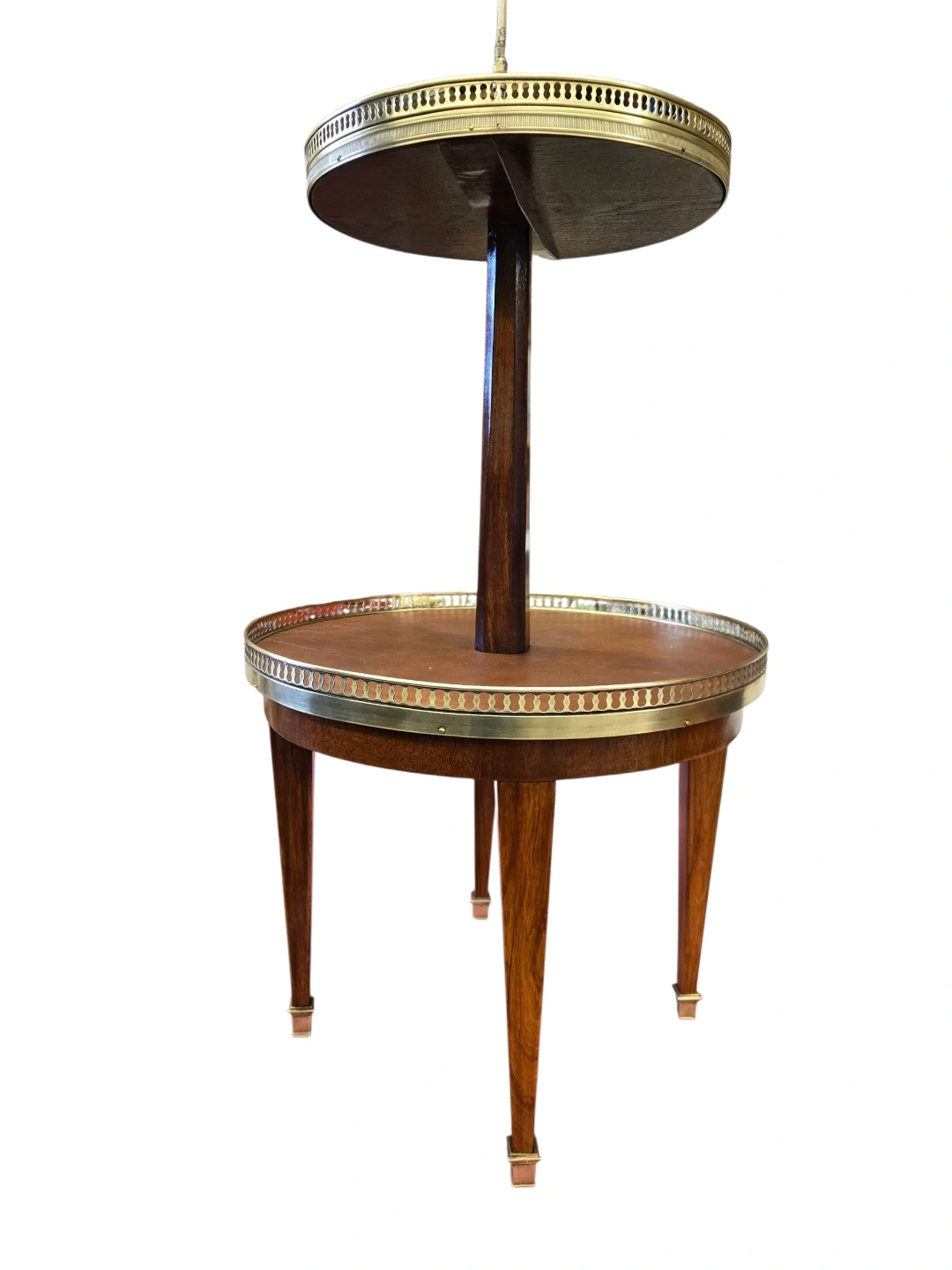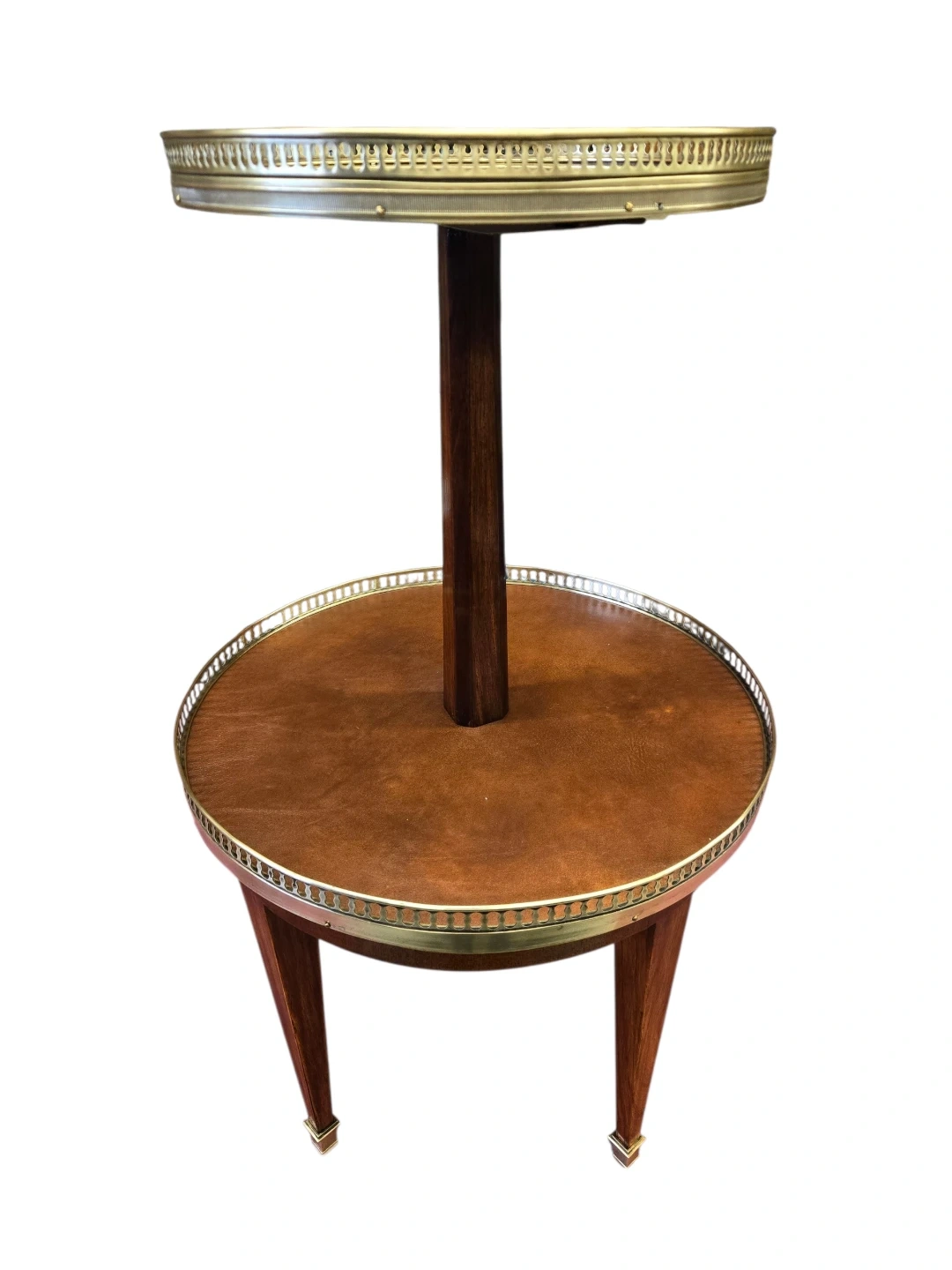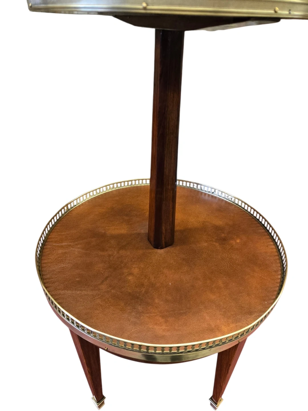 A charming two-tiered side table featuring a decorative terrazzo top shelf and a leatherette-covered lower shelf. The wooden stem and legs add a classic touch. This piece is perfect for displaying drinks or decorative items in any living space!