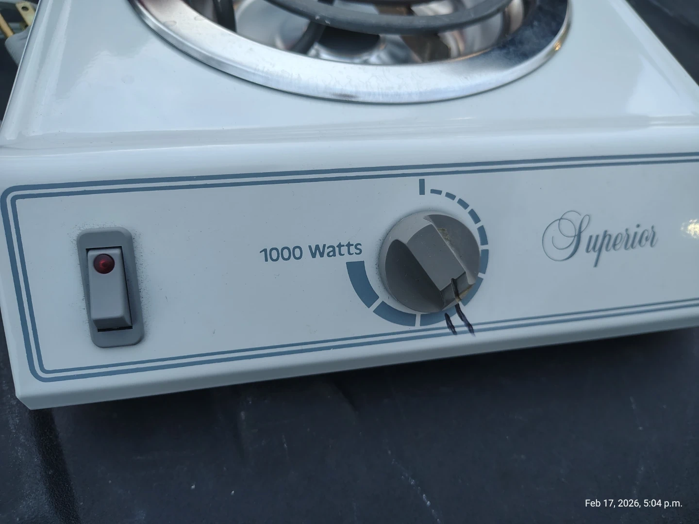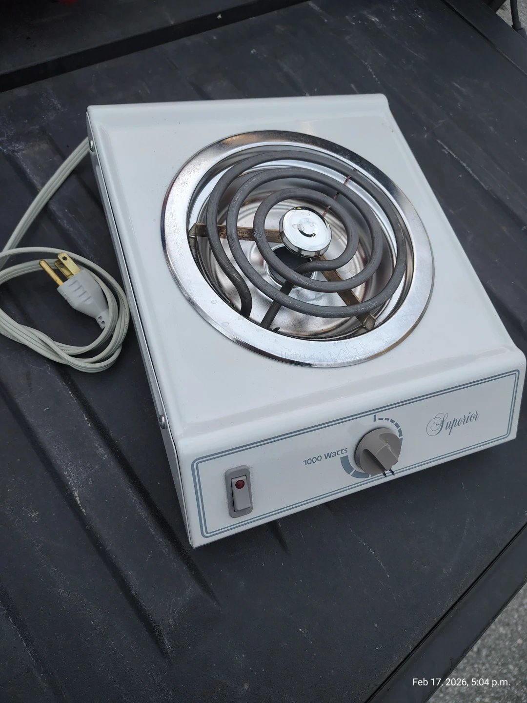 For Sale: Superior 1000 Watt Single Hotplate. Adjust power control with light in indicator. All metal construction. Like New Condition. Located Surrey Fleetwood 83rd Avenue and 168th Street.