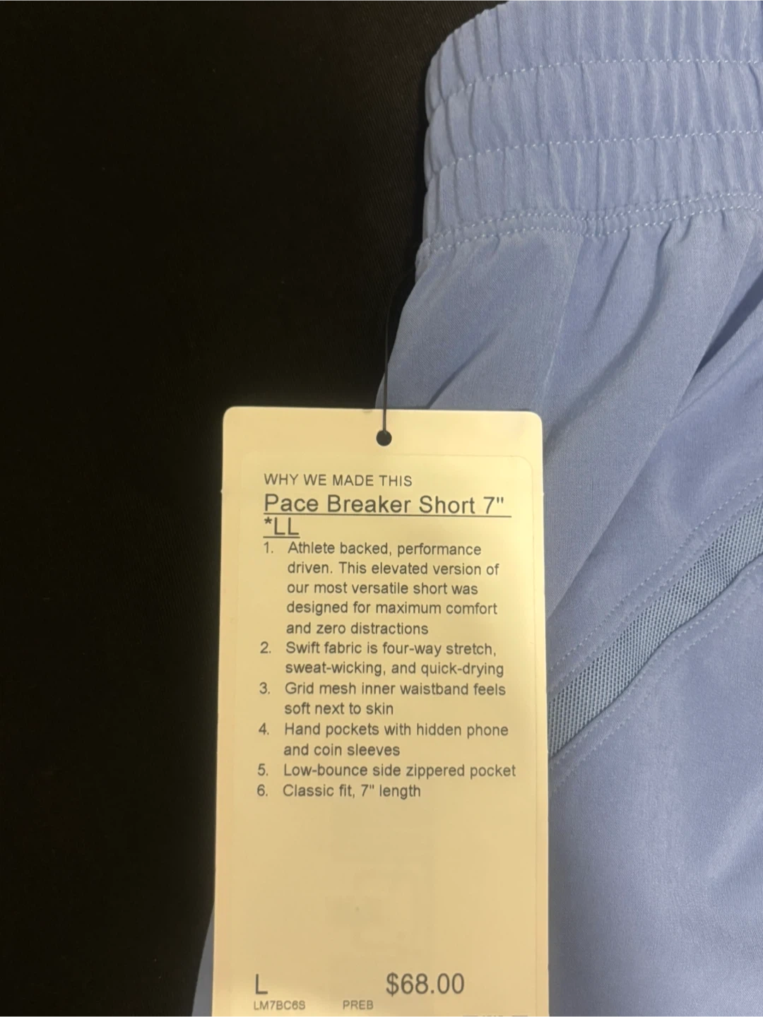 Lululemon Pace Breaker Short 7" for men. Made with swift fabric that's four-way stretch, sweat-wicking, and quick-drying. It has a grid mesh inner waistband that feels soft next to skin. The shorts include hand pockets with hidden phone and coin sleeves, plus a low-bounce side zippered pocket. Classic fit, 7" length.