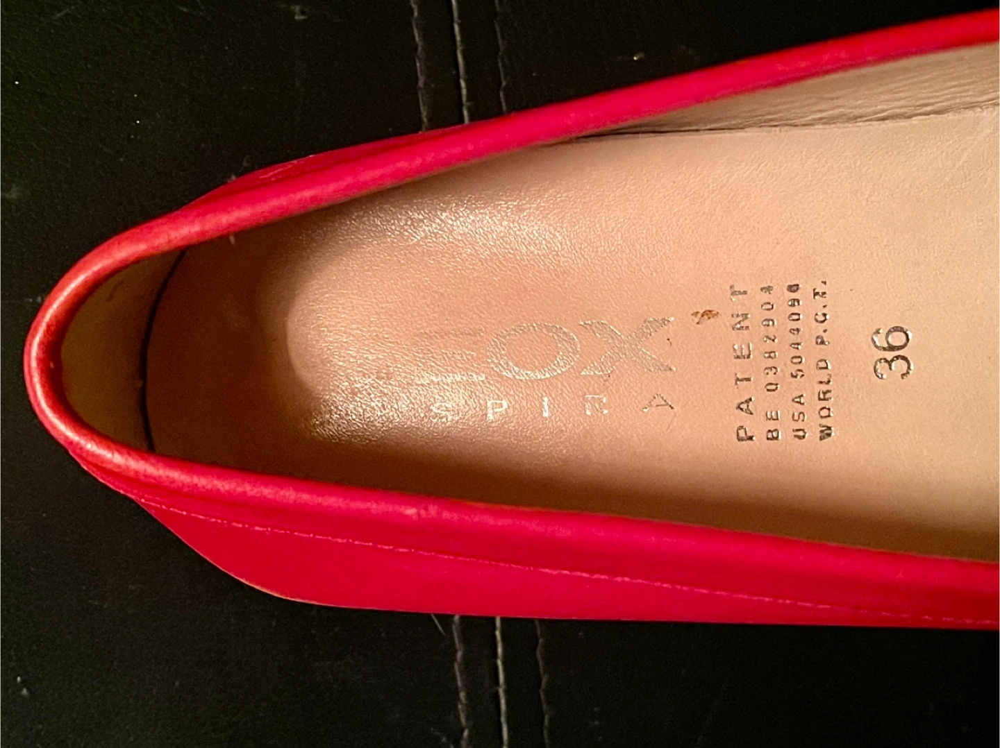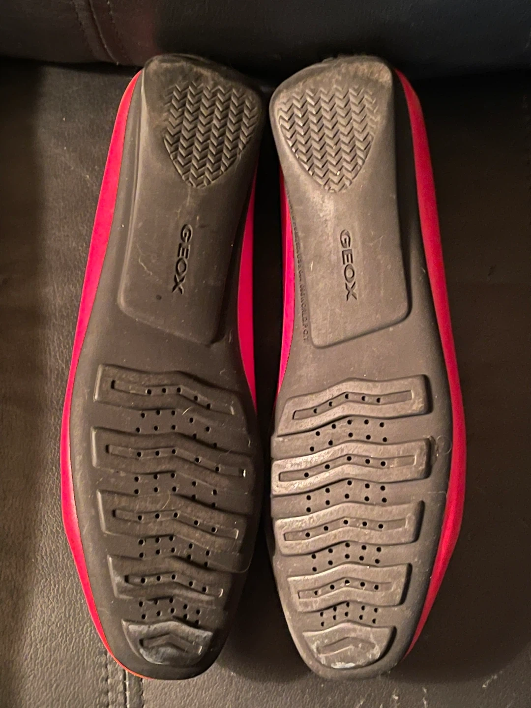 These are Geox Respira red leather loafers with rubber soles. They're a size 36. Perfect for everyday wear! Made by an Italian company known for high-quality comfortable shoes. Made in Morocco. Excellent condition with minimal signs of wear.