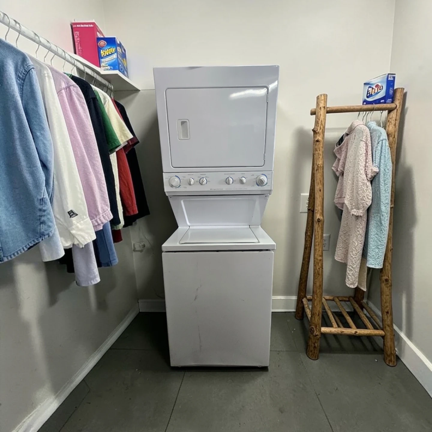 I'm selling a perfectly working Frigidaire stackable washer and dryer, a convenient laundry solution for smaller spaces.