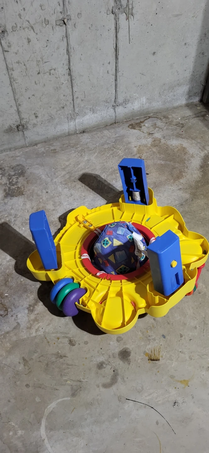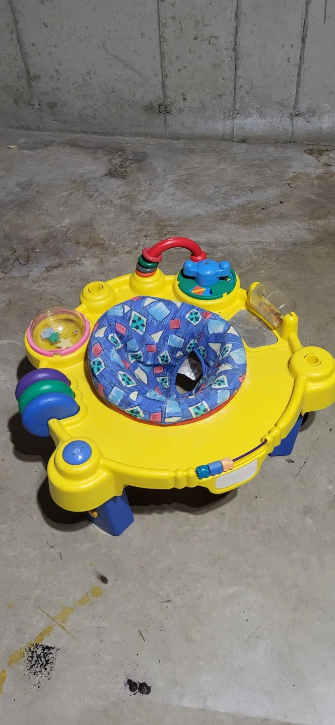 Yellow baby activity center with multiple toys and spinning seat. It has colorful spinning rings and a music player. This activity center is great for babies learning to stand and explore!