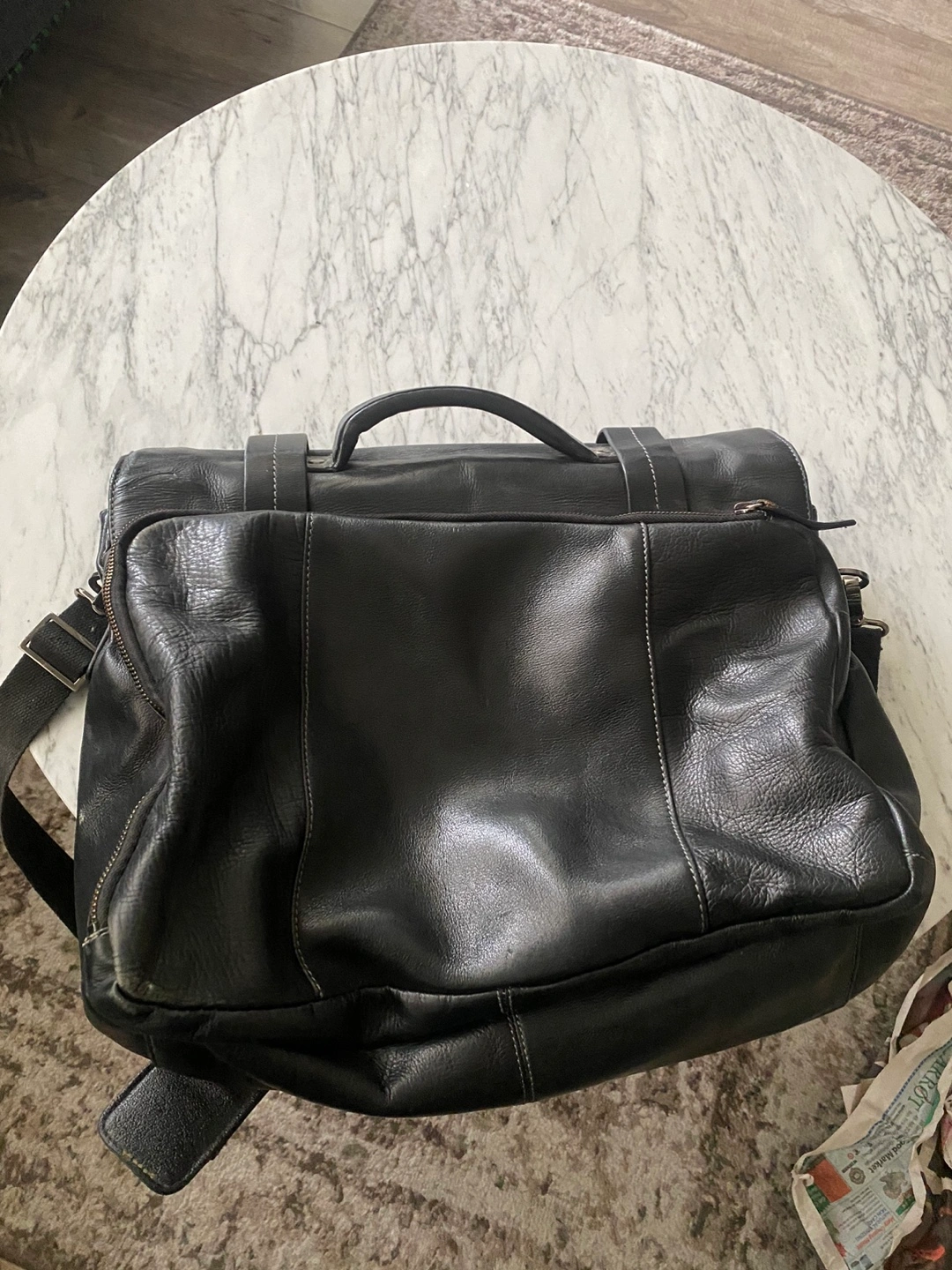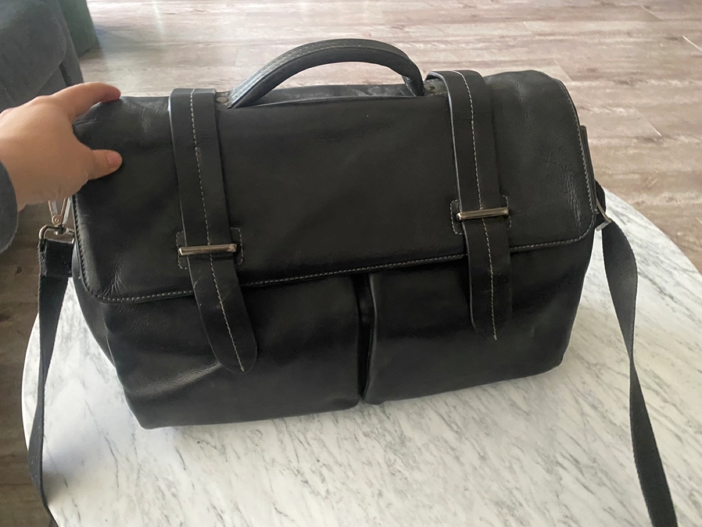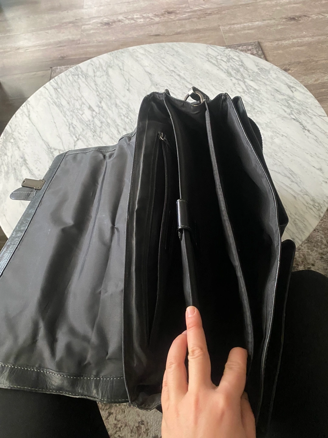 Black leather briefcase. Features a long adjustable strap and a top handle. Has multiple compartments and pockets inside. Great for work or travel.