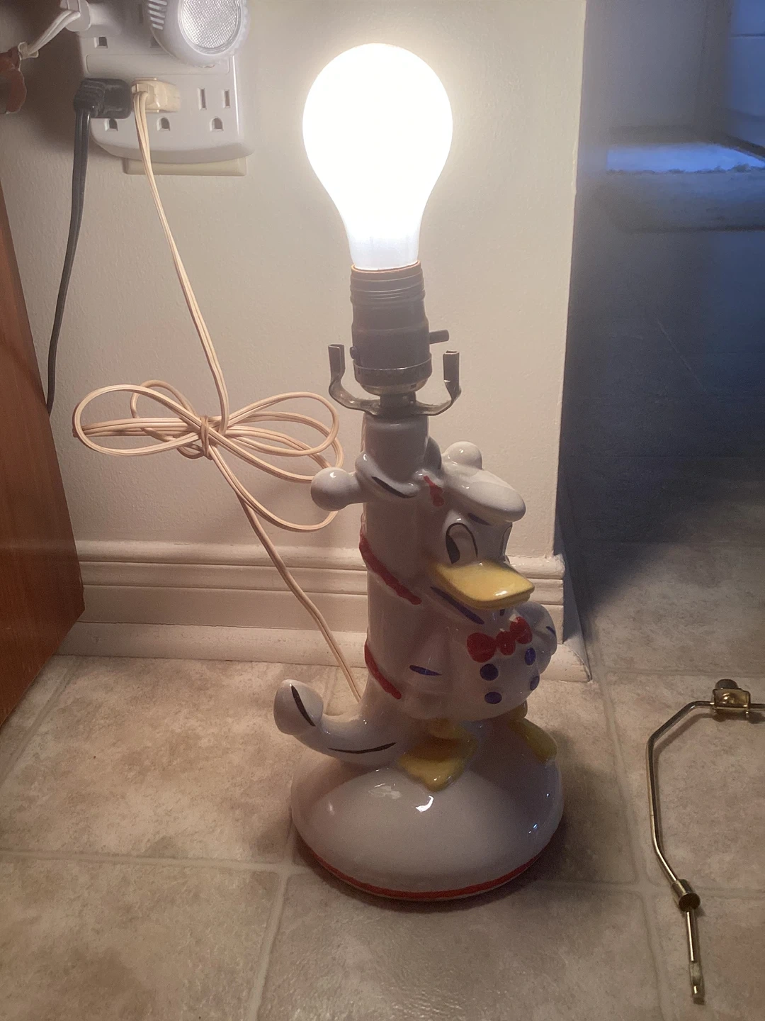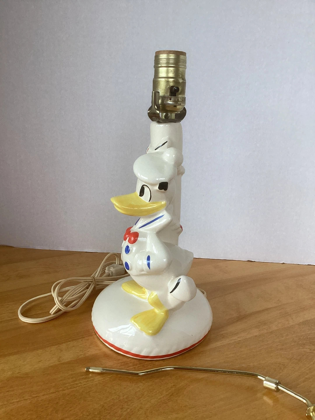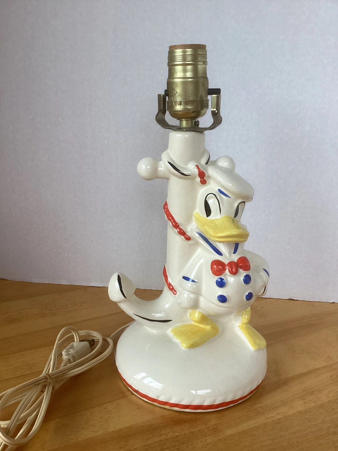 Vintage ceramic lamp featuring Donald Duck made by the Leeds company 1940’s. Superior condition. Paint is prestige. No chips in ceramic. Works perfectly. This would be an awesome addition for any Disney collector. Can be found on other sites, in lesser condition, for up to $220 US!