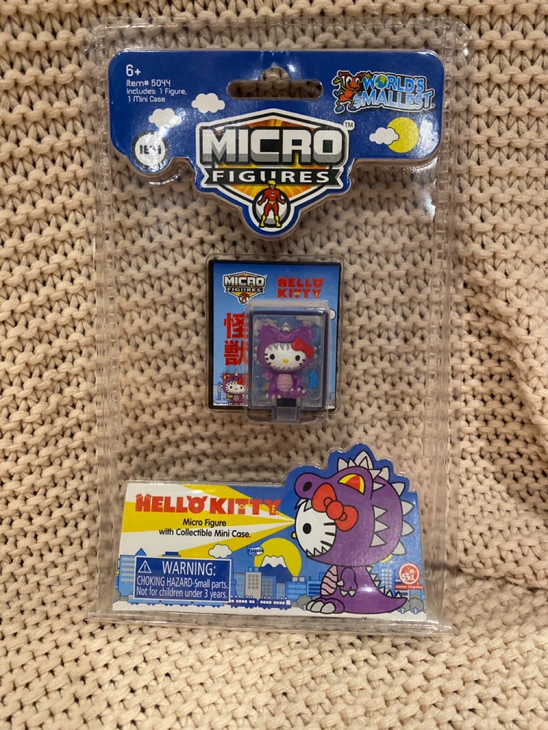 This is a World's Smallest Micro Figures collectible mini case featuring Hello Kitty dressed as a dinosaur. It includes 1 figure and 1 mini case. Recommended for ages 6 and up.