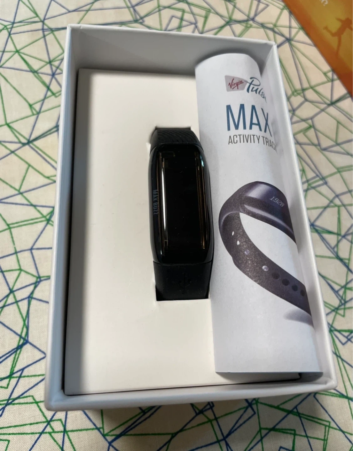 This is a Virgin Pulse MAX BUZZ activity tracker. It's black in colour and comes in its original packaging. Includes instructions.