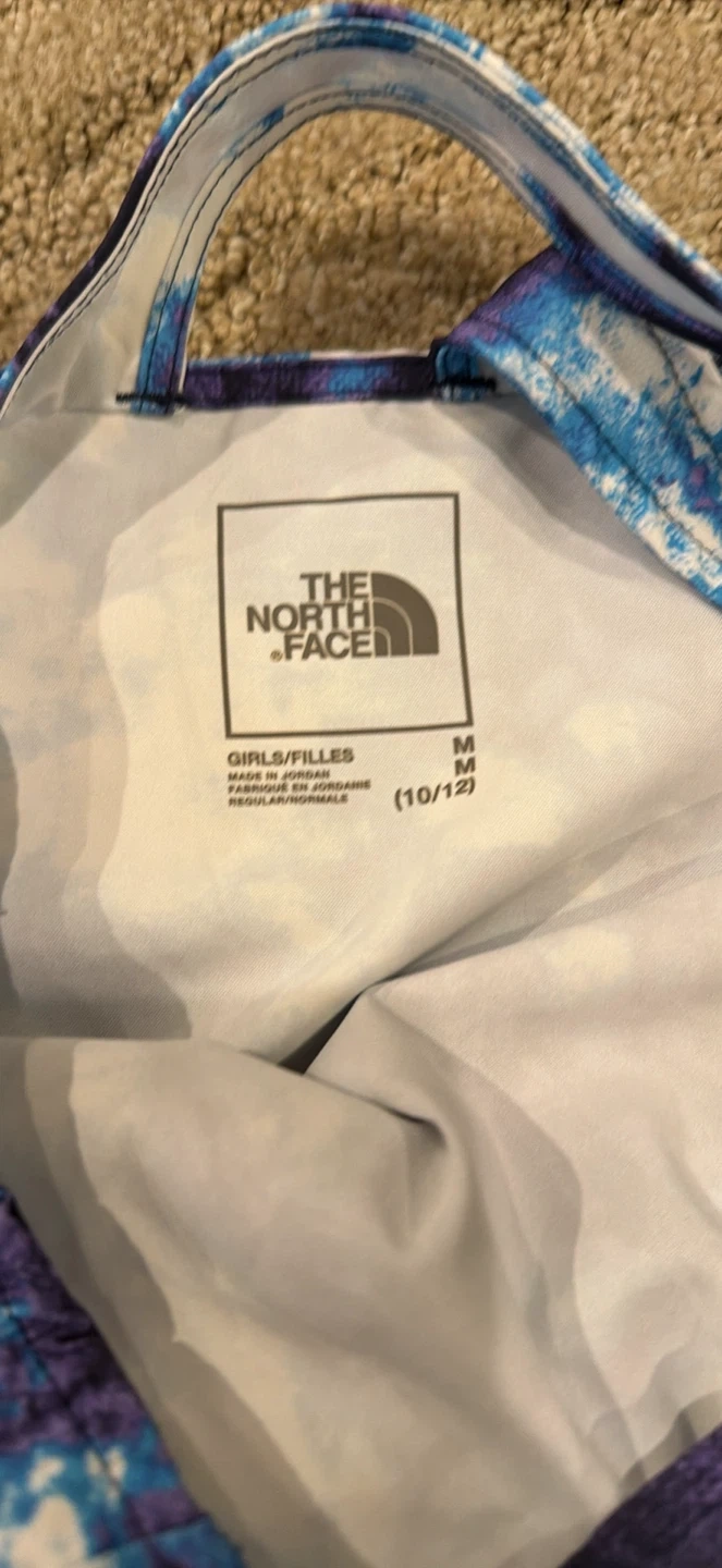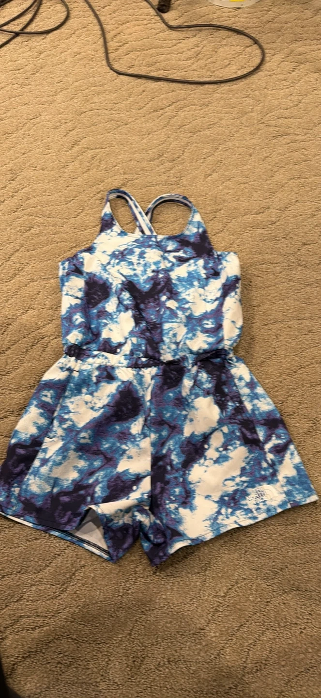 This is a cute romper from The North Face. It's a girls' size medium, which fits a 10/12. The fabric is lightweight and perfect for warmer weather! Wore once paid 55$