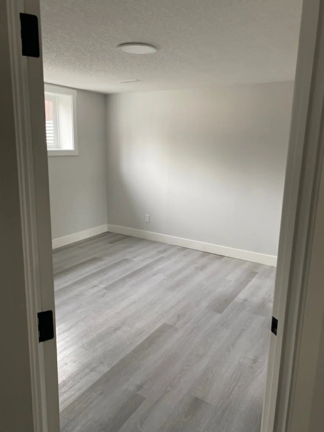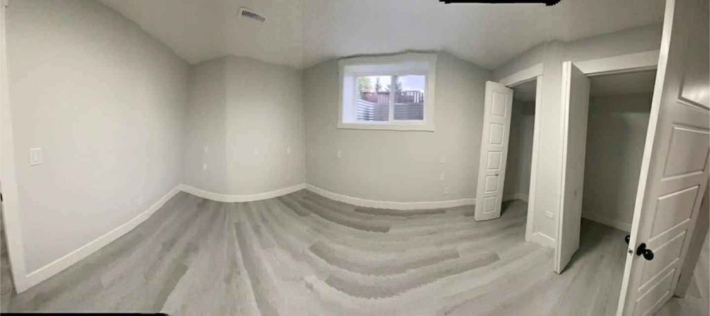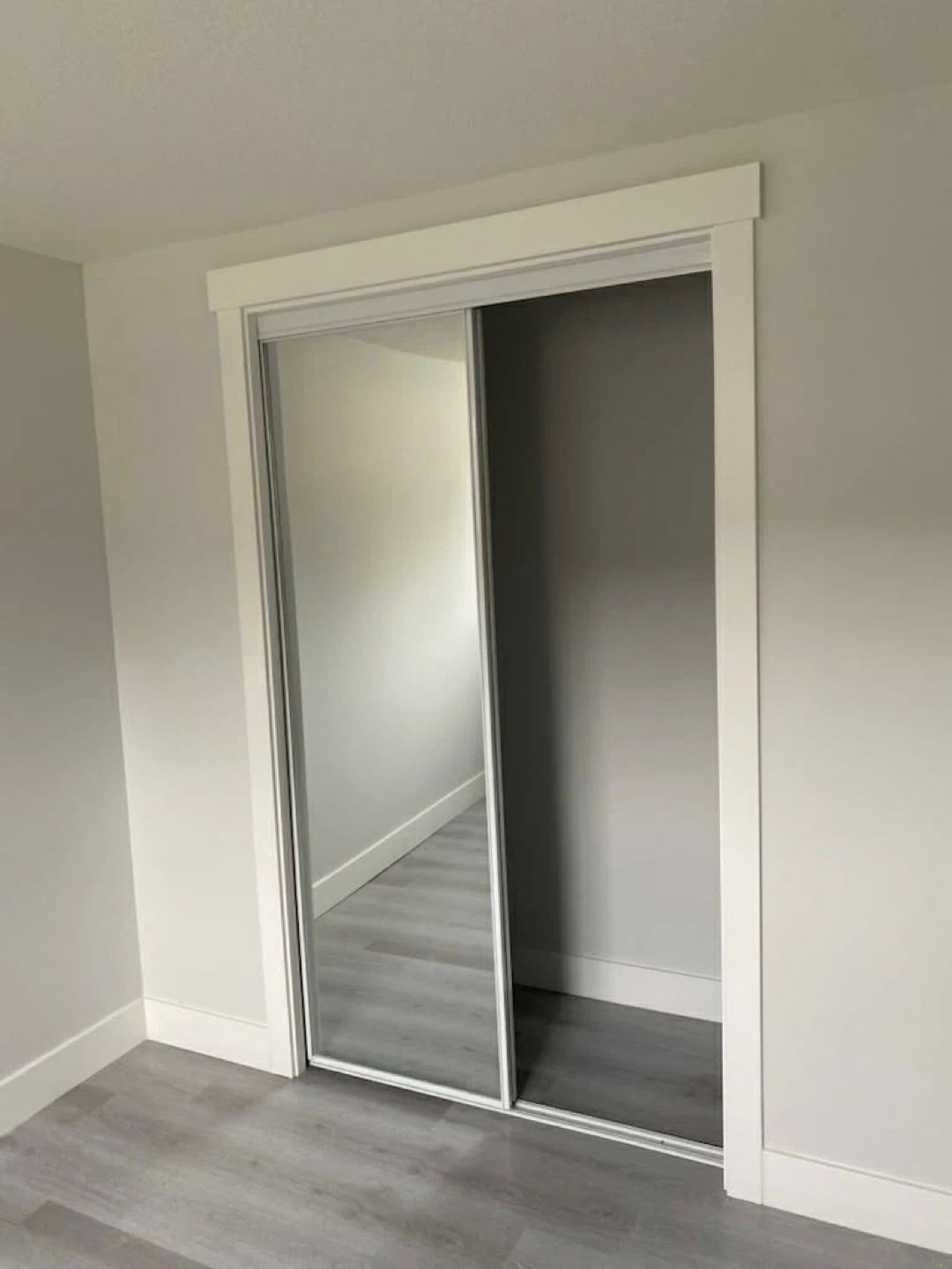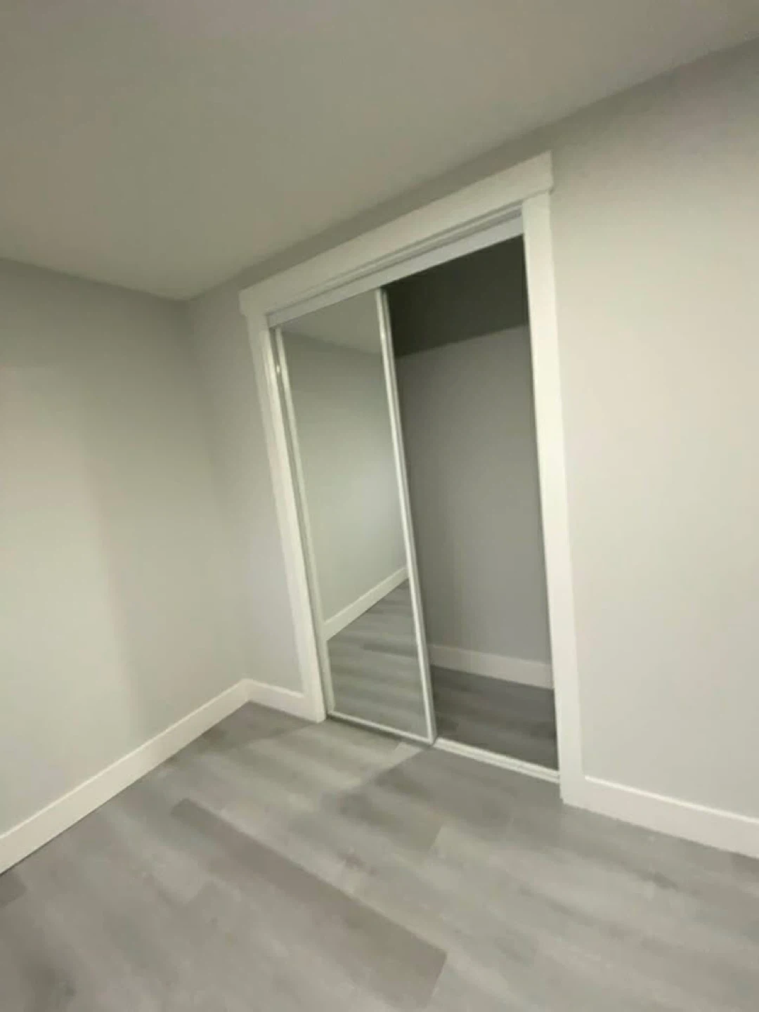 This is a clean, neutral bedroom space with modern wood-look laminate flooring. It features a double-door closet with mirrored sliding doors. A window provides natural light. Ready for your personal rent included utilities
