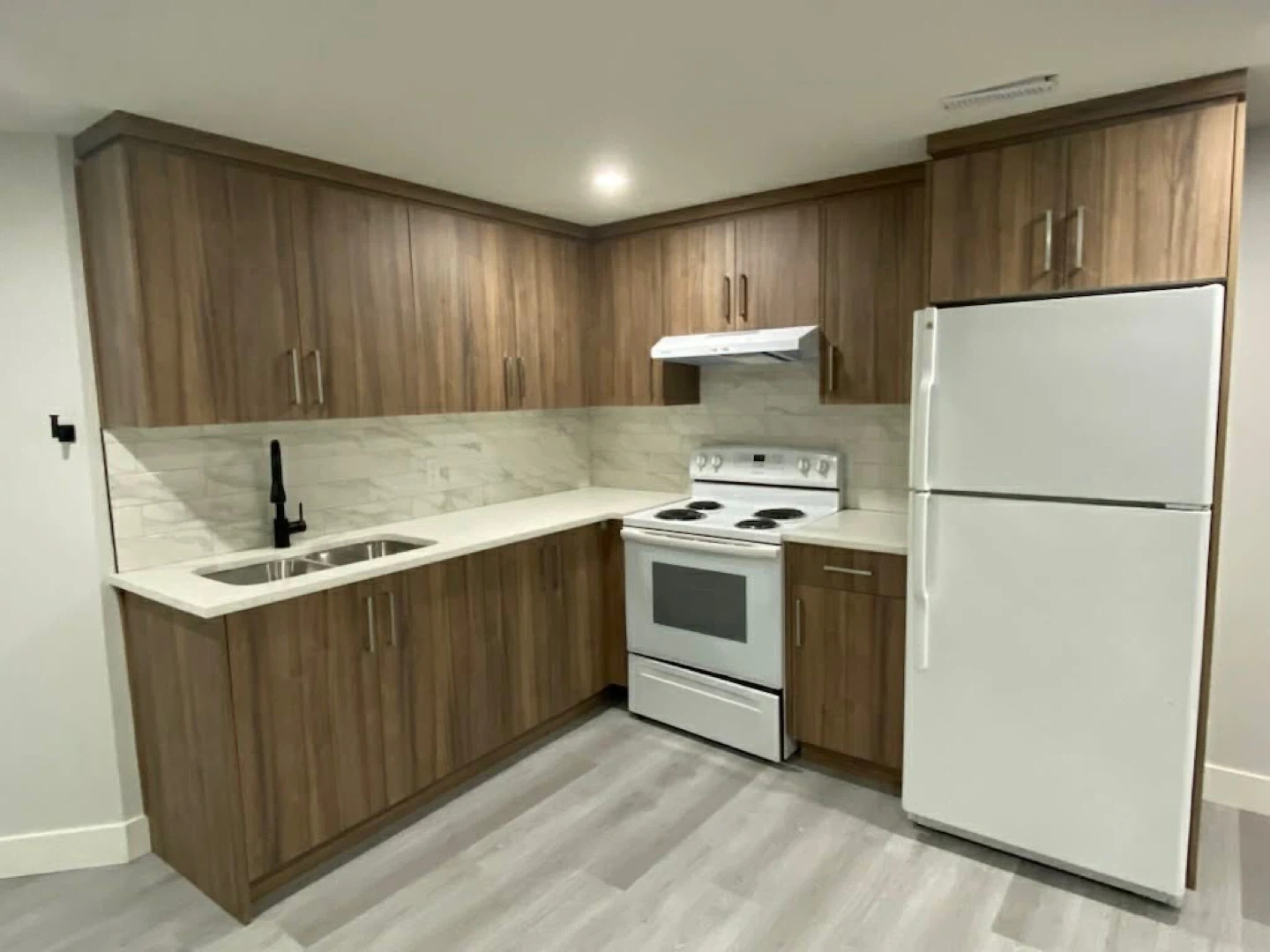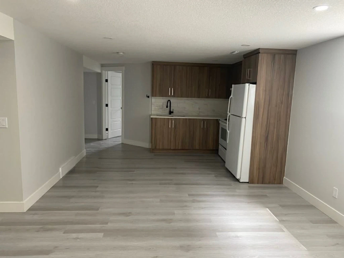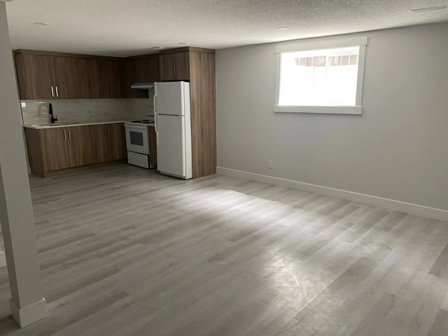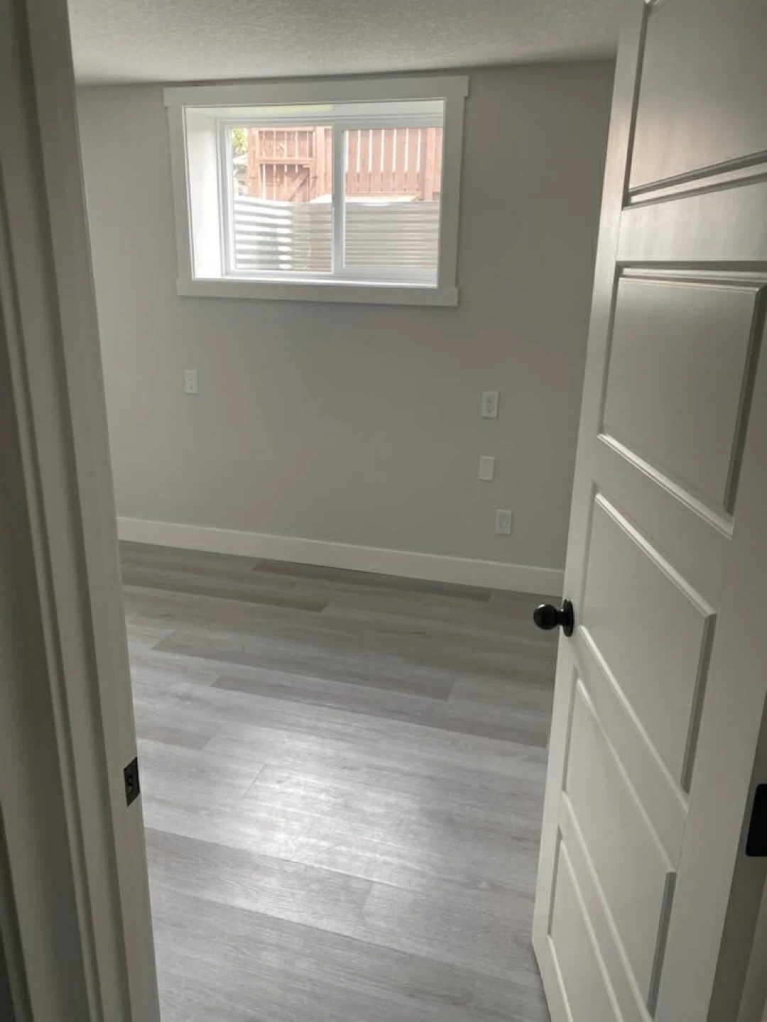 This is a clean, neutral bedroom space with modern wood-look laminate flooring. It features a double-door closet with mirrored sliding doors. A window provides natural light. Ready for your personal rent included utilities