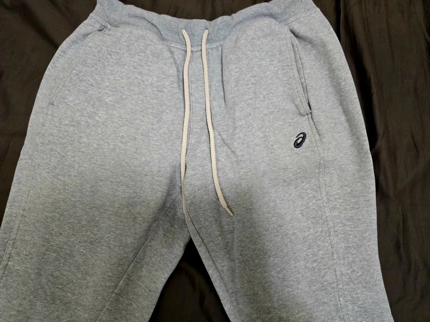 Men's Grey sweatpants from Asics with cuffed legs. 3 pockets. Internal fleece lining. Color: Grey, Size: Medium