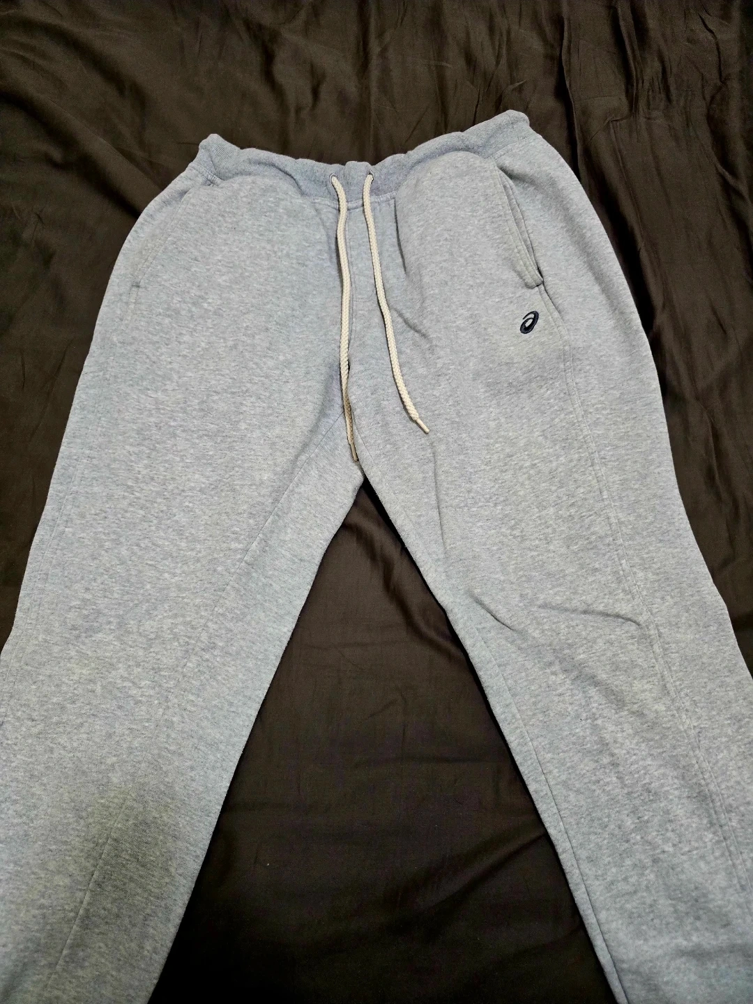 Men's Grey sweatpants from Asics with cuffed legs. 3 pockets. Internal fleece lining. Color: Grey, Size: Medium
