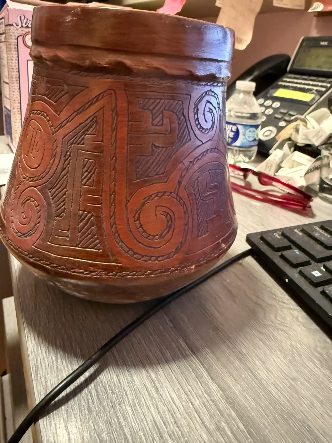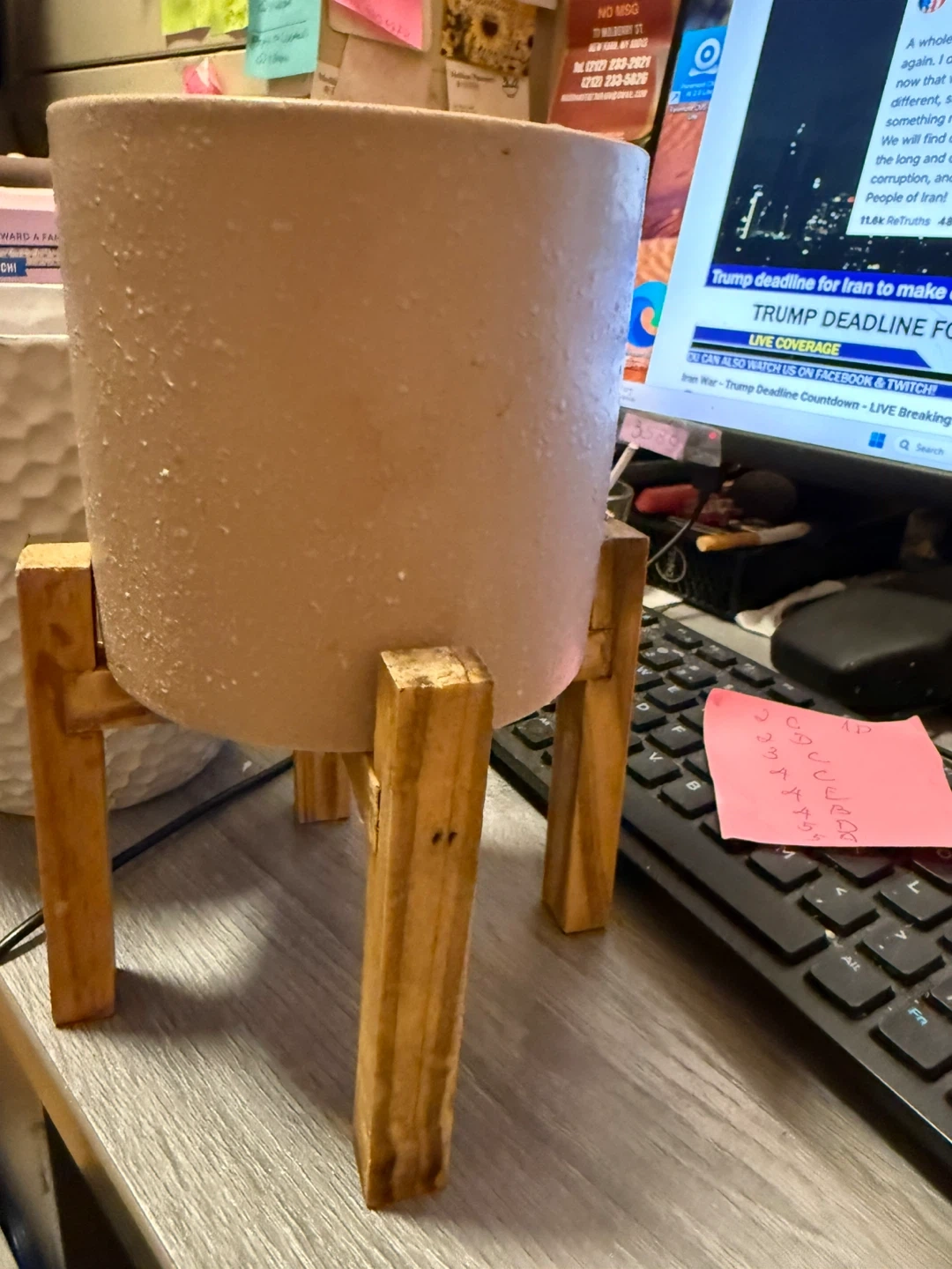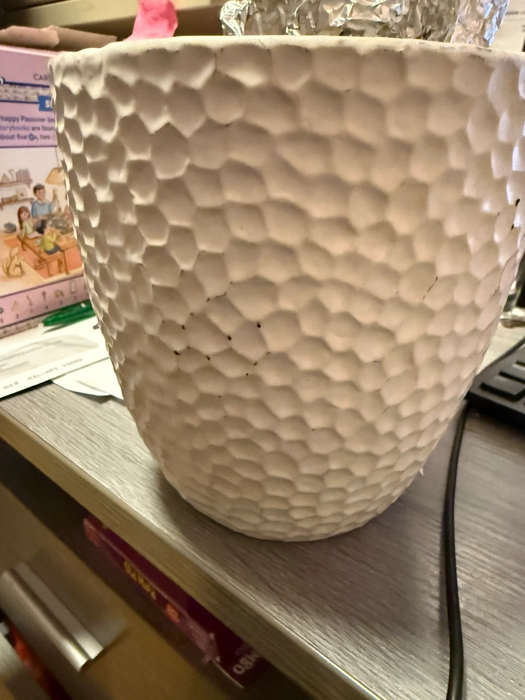 This textured ceramic pot has a unique honeycomb pattern. It's designed to hold a plant and comes with a wooden stand. Great for adding a touch of modern style to your home!