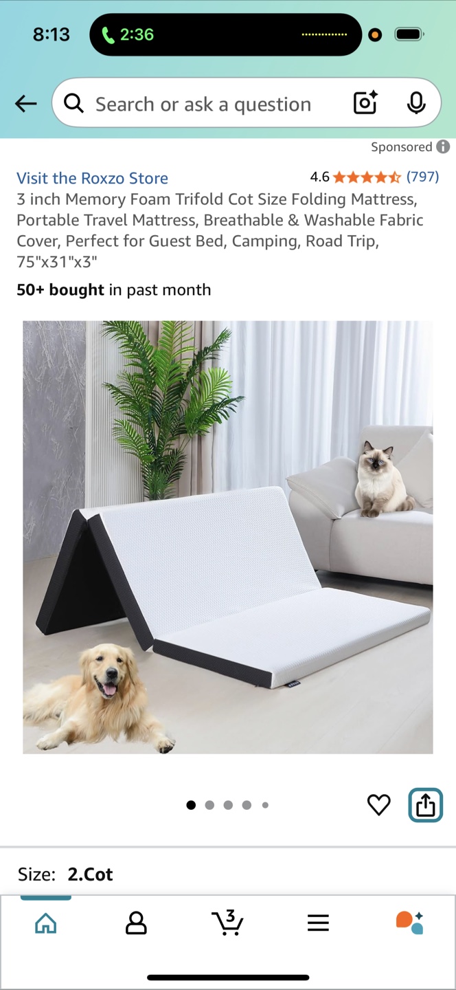 Selling a Roxzo 3-inch memory foam trifold cot size folding mattress. It's perfect for guest beds, camping, or road trips. The mattress is breathable and has a washable fabric cover. It measures 75"x31"x3".