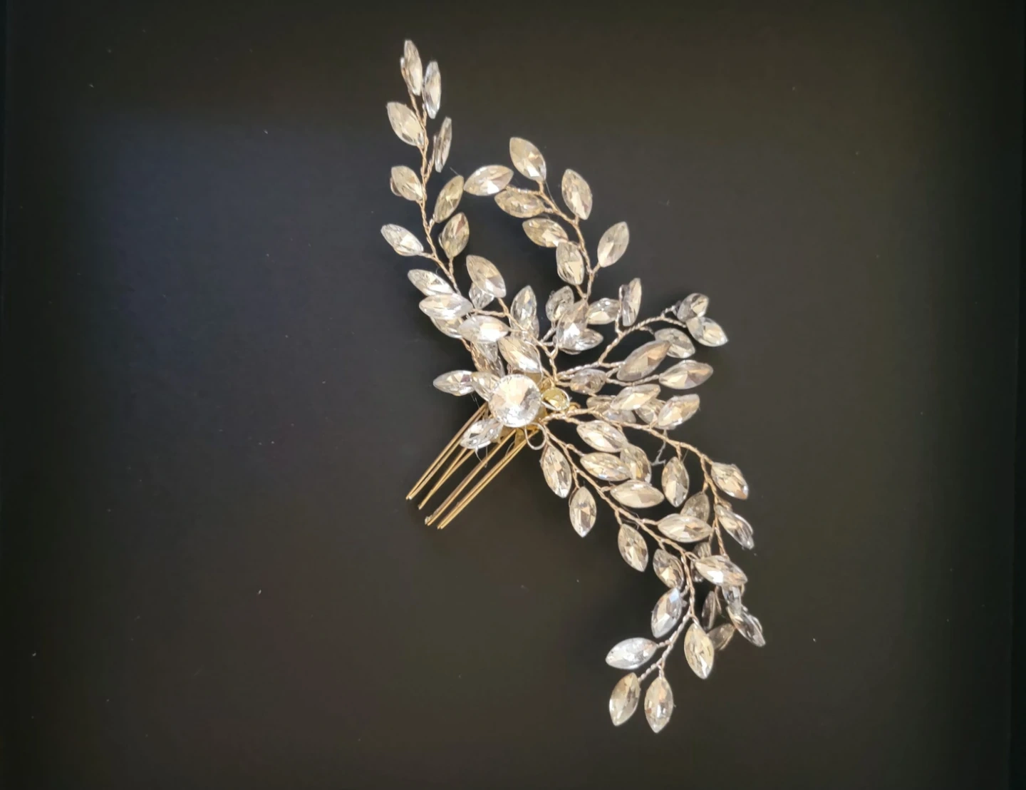 Sparkling gold-tone Hair Accessories adorned with clear crystals shaped like leaves. It has a comb base for secure placement. This decorative piece is perfect for adding a touch of glamour to updos.