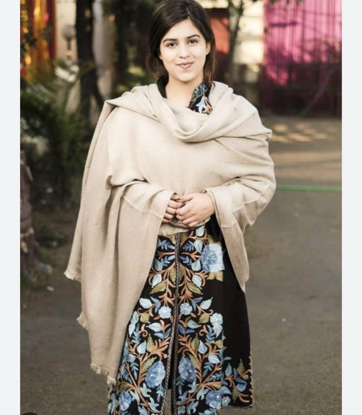 It's a cozy, neutral-toned shawl. This outfit is perfect for cooler weather occasions. Shawl is a soft knit material.