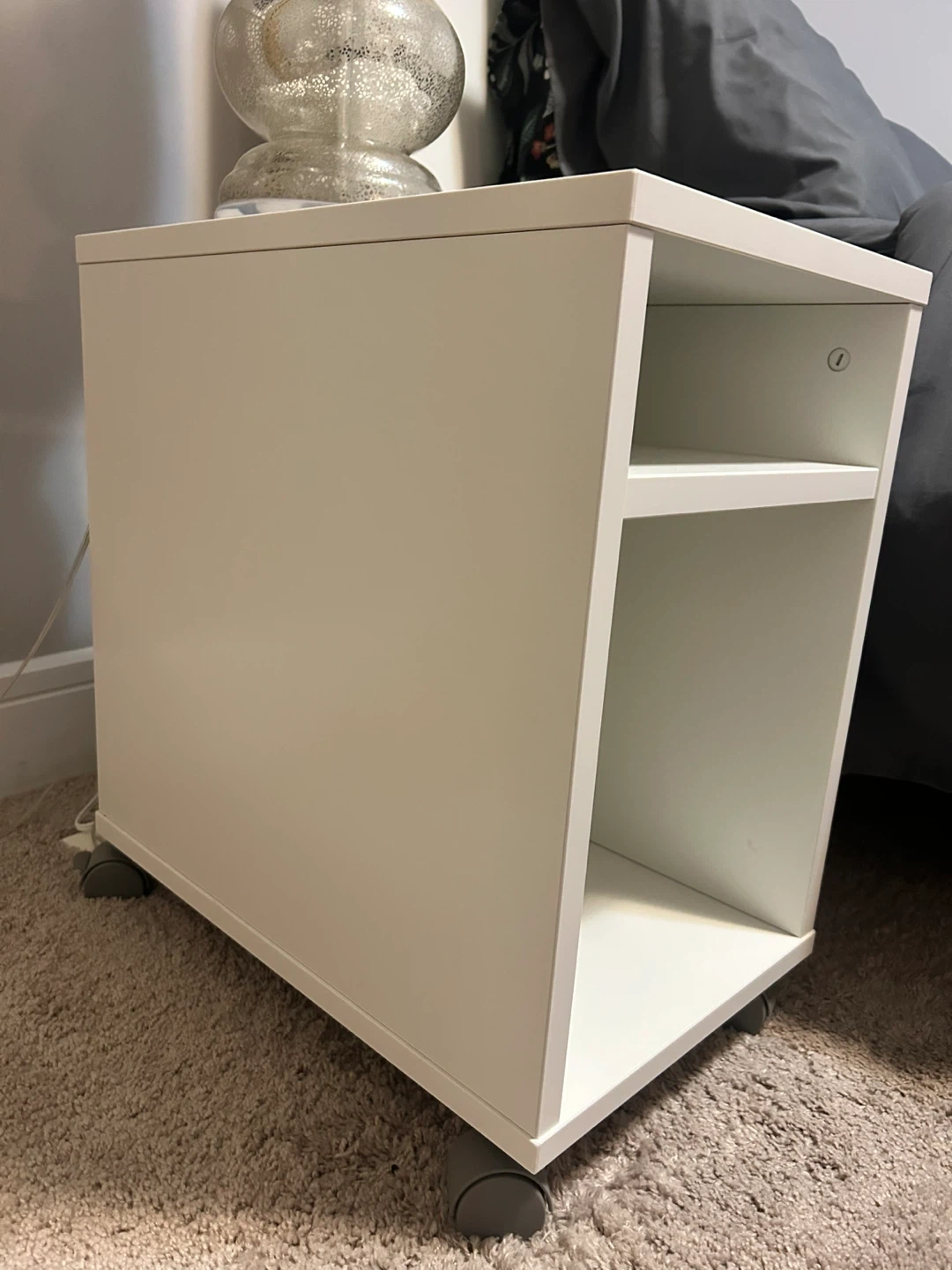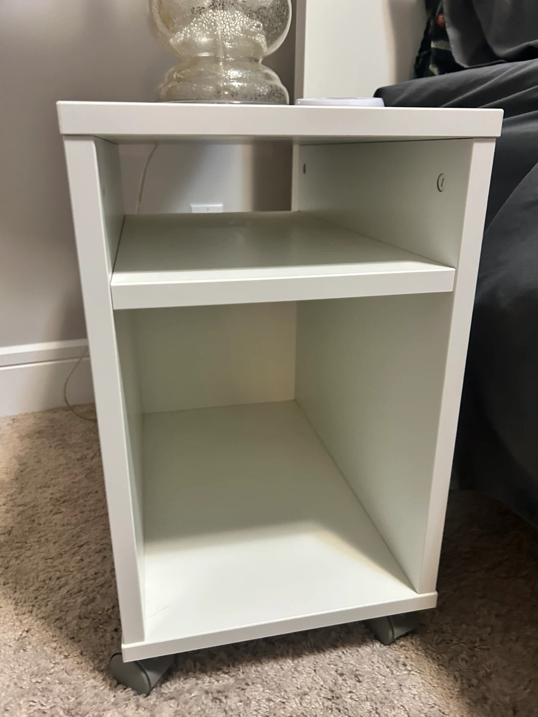 Two white side table with two open shelves. It's on wheels for easy moving. Great for extra storage next to a sofa or bed! $40 for both.