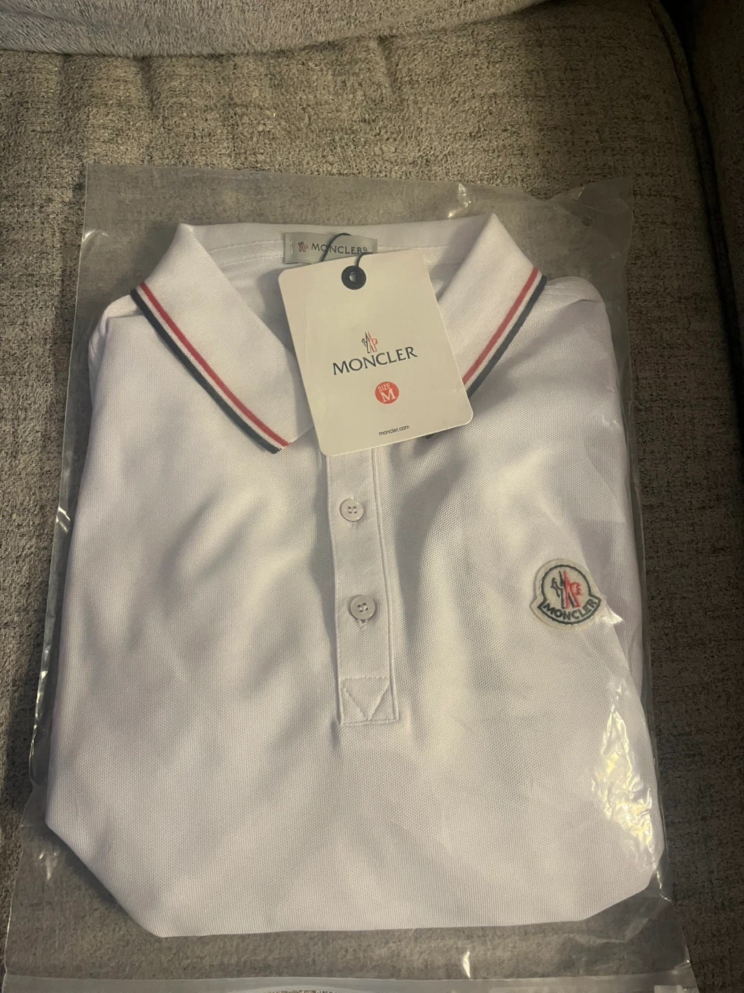This is a white Moncler polo shirt. It features a classic collar with red and navy trim. The Moncler logo is embroidered on the chest.
