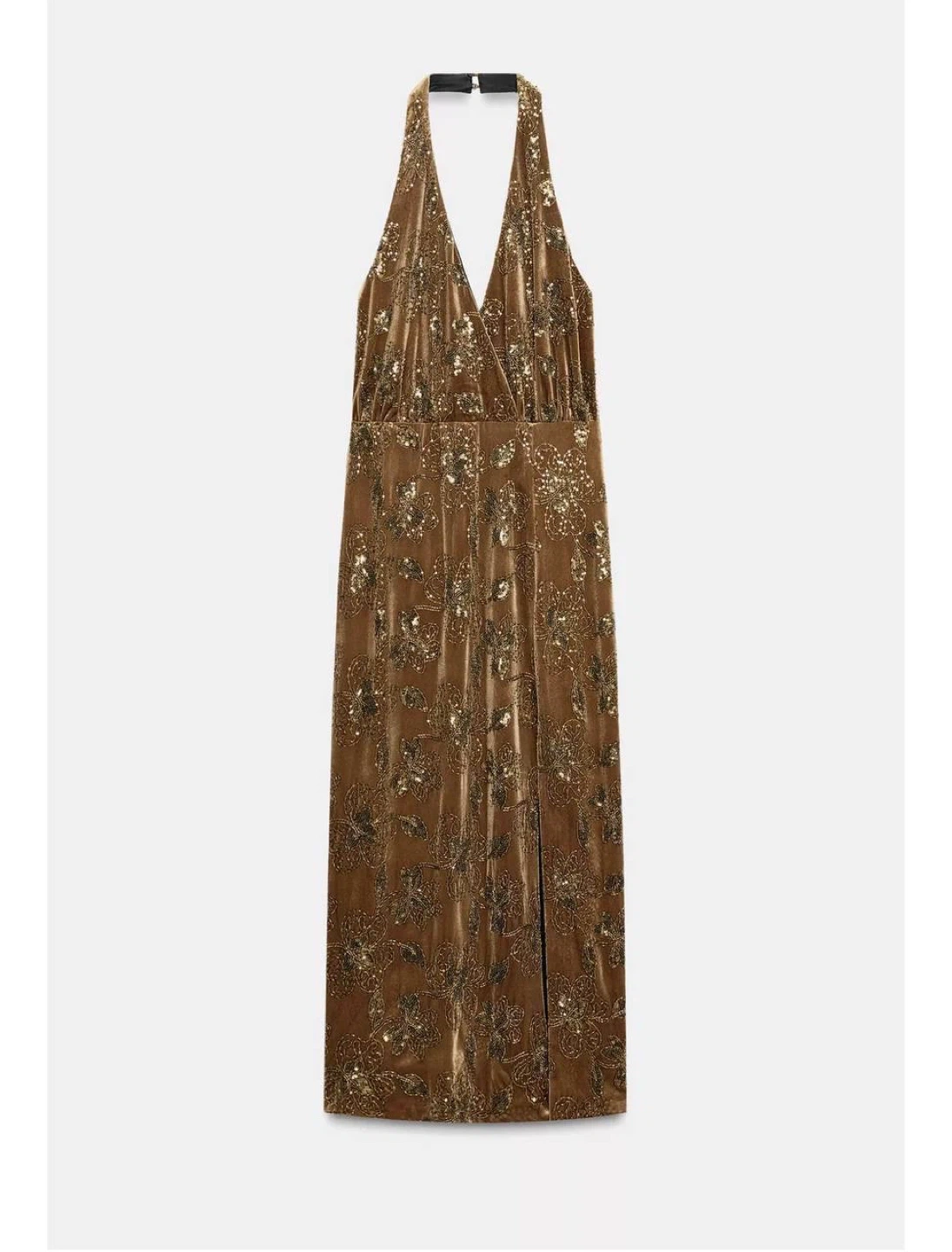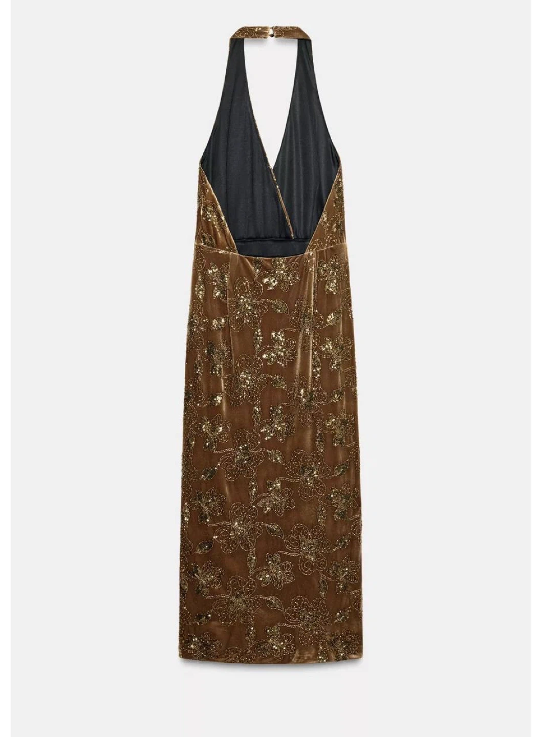 Elegant velvet midi dress from ZARA with subtle sequin detailing that adds a soft, luxurious shimmer. The feminine silhouette with a deep neckline and front slit makes it perfect for evenings, parties, or special occasions.