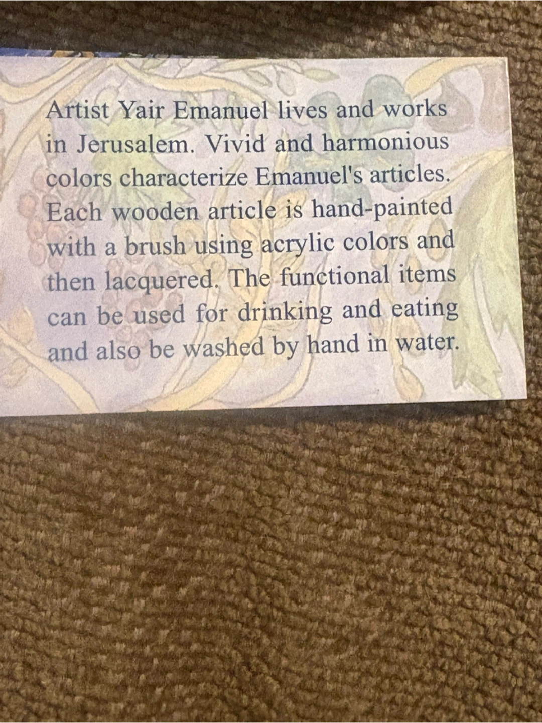 This is a beautiful hand-painted wooden Kiddush cup and tray set by Yair Emanuel. Vivid and harmonious colours characterize these articles. The wooden items are hand-painted with a brush using acrylic colours and then lacquered. These functional items can be used for drinking and eating and are washed by hand in water.