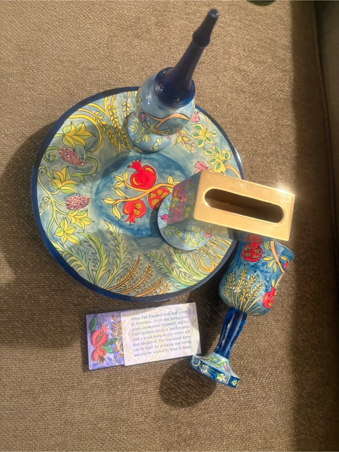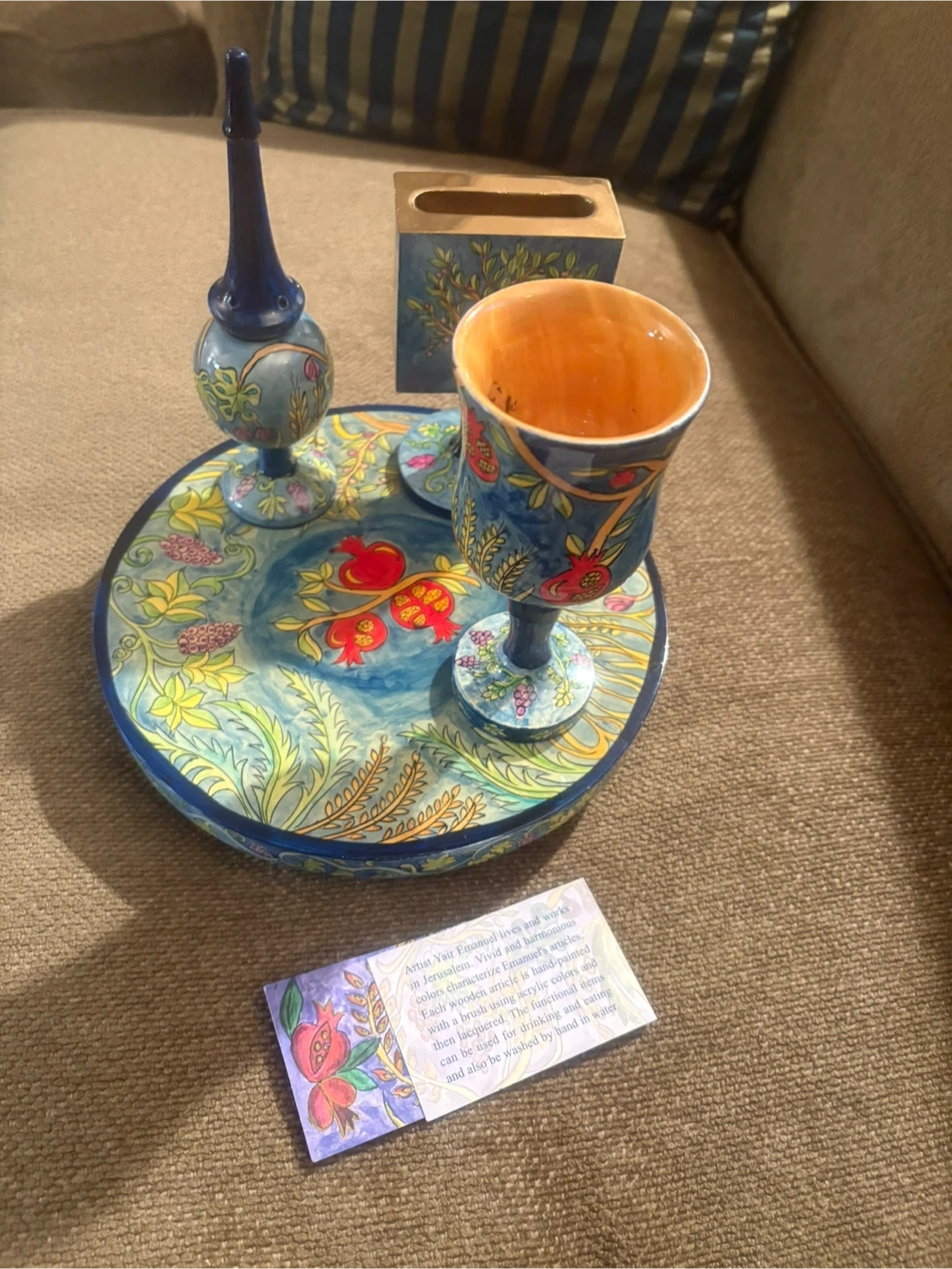 Yair Emanuel Hand-Painted Wooden Kiddush Cup and Tray Set