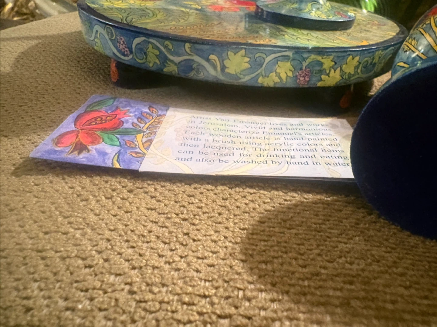 This is a beautiful hand-painted wooden Kiddush cup and tray set by Yair Emanuel. Vivid and harmonious colours characterize these articles. The wooden items are hand-painted with a brush using acrylic colours and then lacquered. These functional items can be used for drinking and eating and are washed by hand in water.