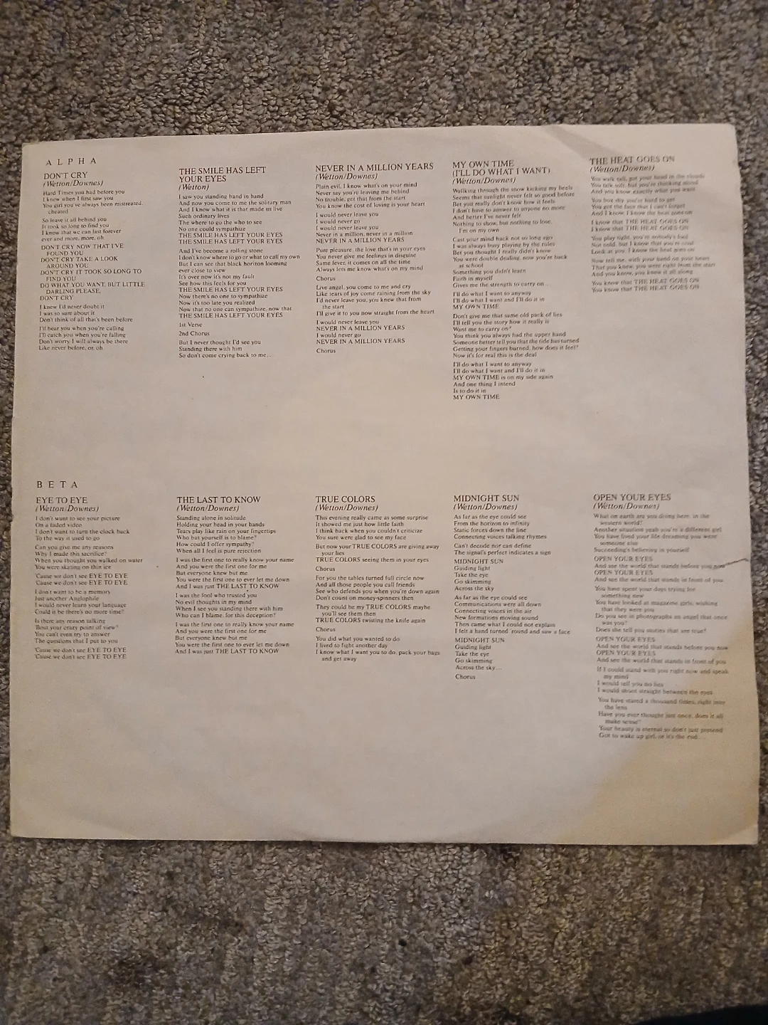 This is the 1983 vinyl record LP "Alpha" by ASIA. It includes the tracks Alpha, Don't Cry, The Smile Has Left Your Eyes, Never In A Million Years, and My Own Time. Also featured are Beta, The Last To Know, True Colours, Midnight Sun, and Open Your Eyes. It's manufactured by Geffen Records.