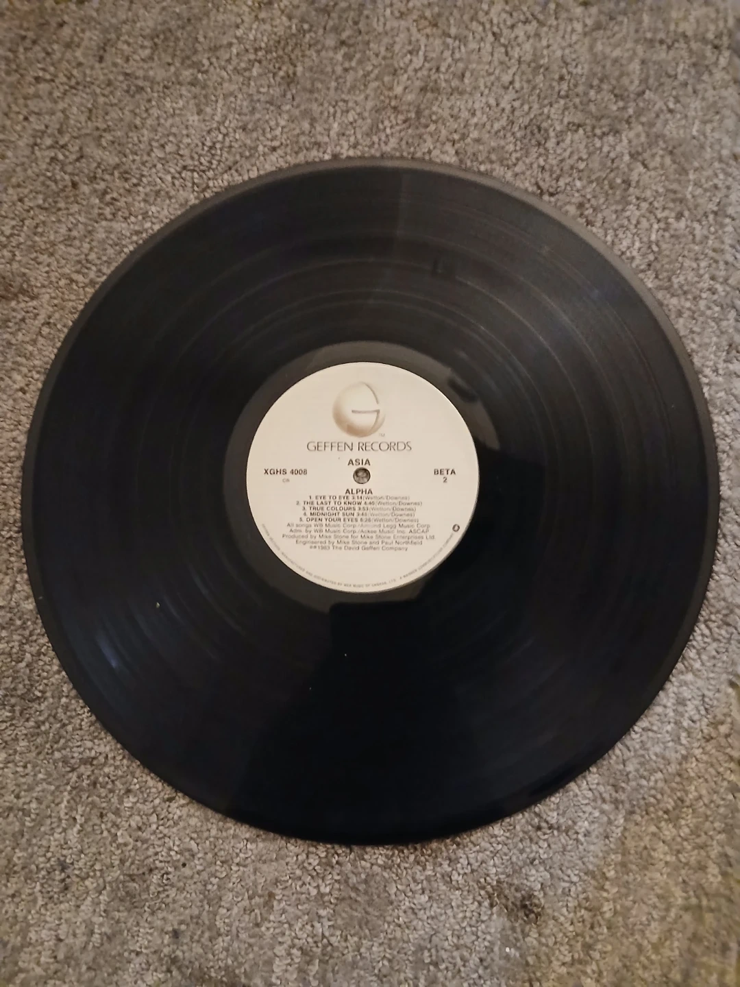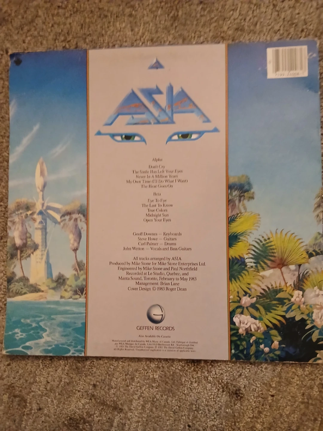 This is the 1983 vinyl record LP "Alpha" by ASIA. It includes the tracks Alpha, Don't Cry, The Smile Has Left Your Eyes, Never In A Million Years, and My Own Time. Also featured are Beta, The Last To Know, True Colours, Midnight Sun, and Open Your Eyes. It's manufactured by Geffen Records.