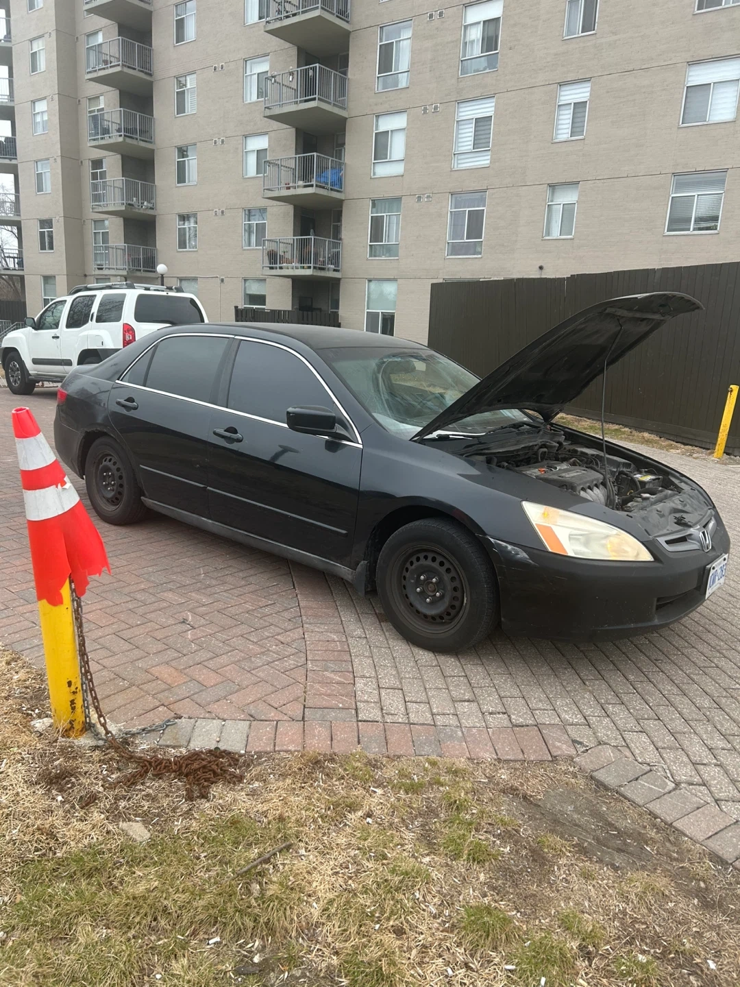 Black Honda Accord sedan. It's a four-door model with tinted windows and the hood is open. It needs to be certified but it runs all lights work as well as the a/c. It has 414 000 kms on it. It starts on one go also the transmission is good.