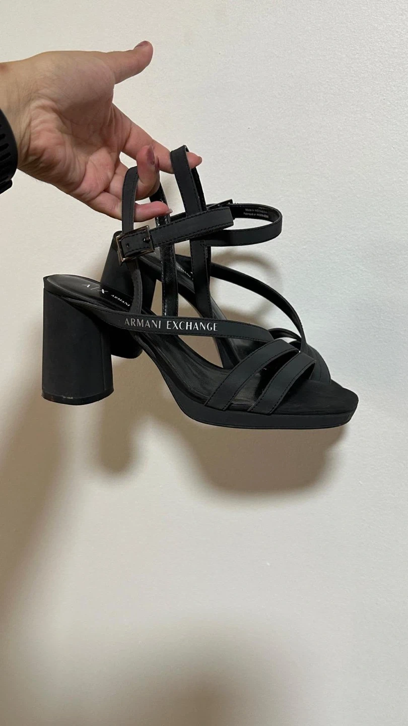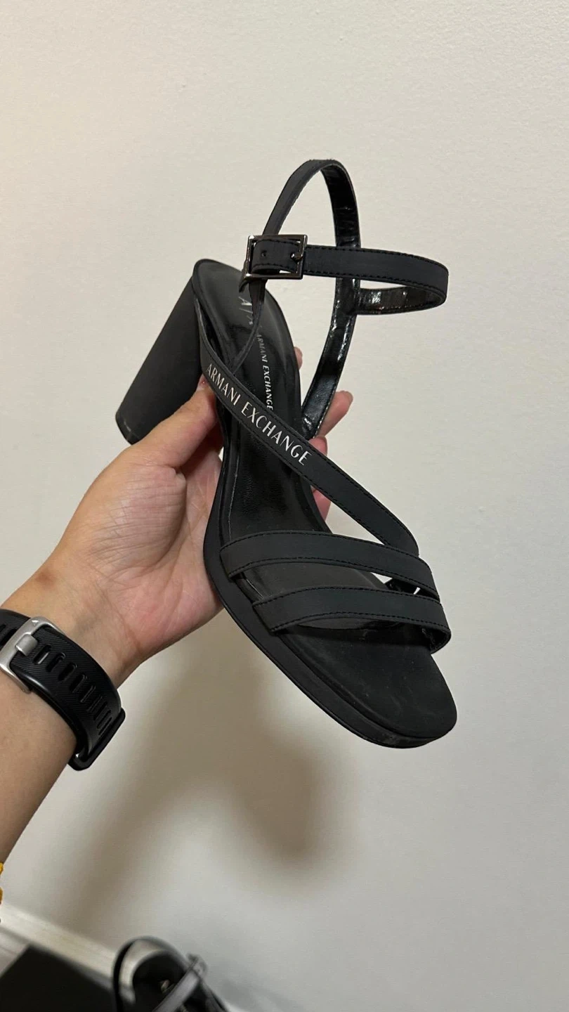 Black heeled sandals from Armani Exchange. Features a chunky heel and ankle strap. Comes with original box. Perfect for dressing up an outfit!