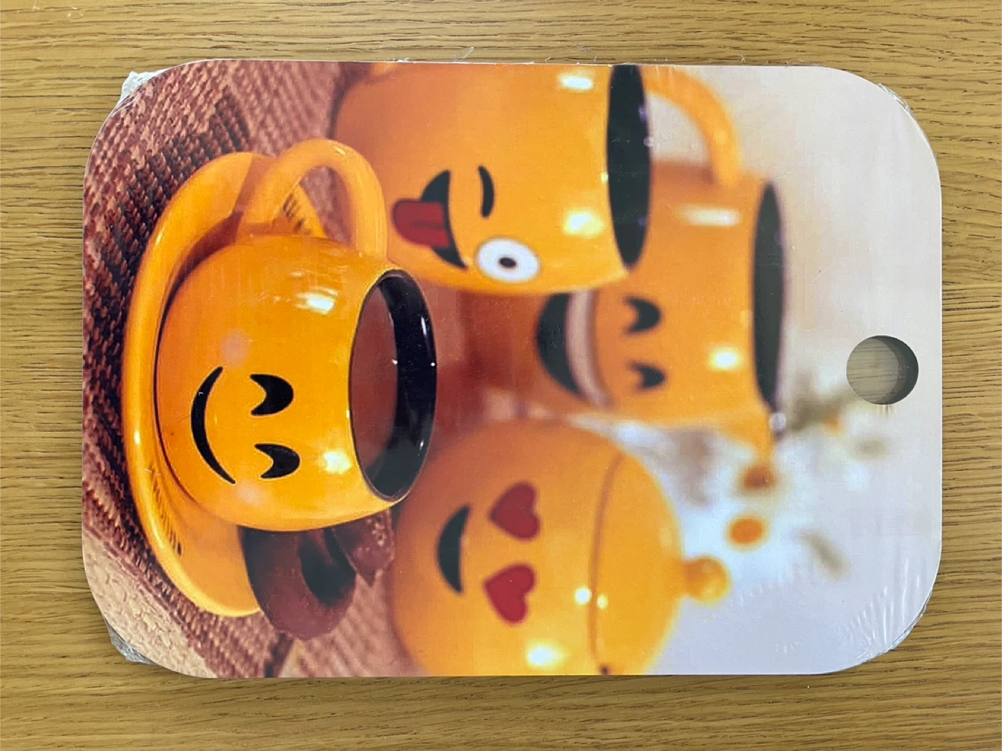 Brand New Wooden Cutting Board with Emoji Mugs Print