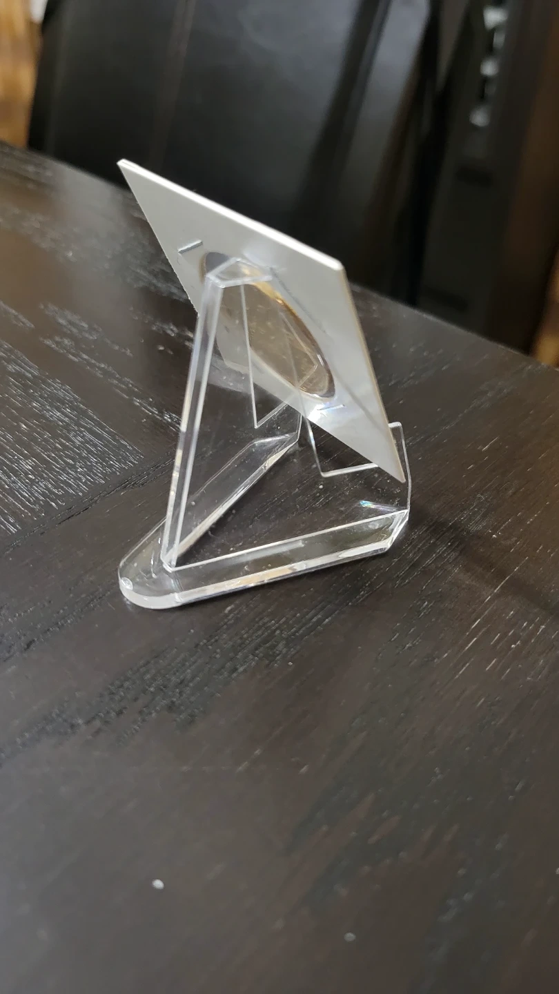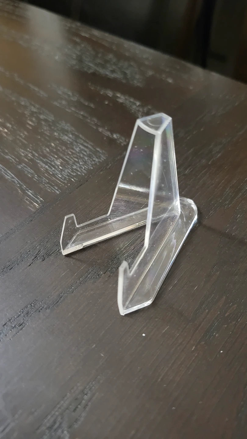 This clear acrylic stand is perfect for displaying small collectibles like cards or coins. It's made of durable acrylic material. This stand's small size makes it easy to place on any surface.