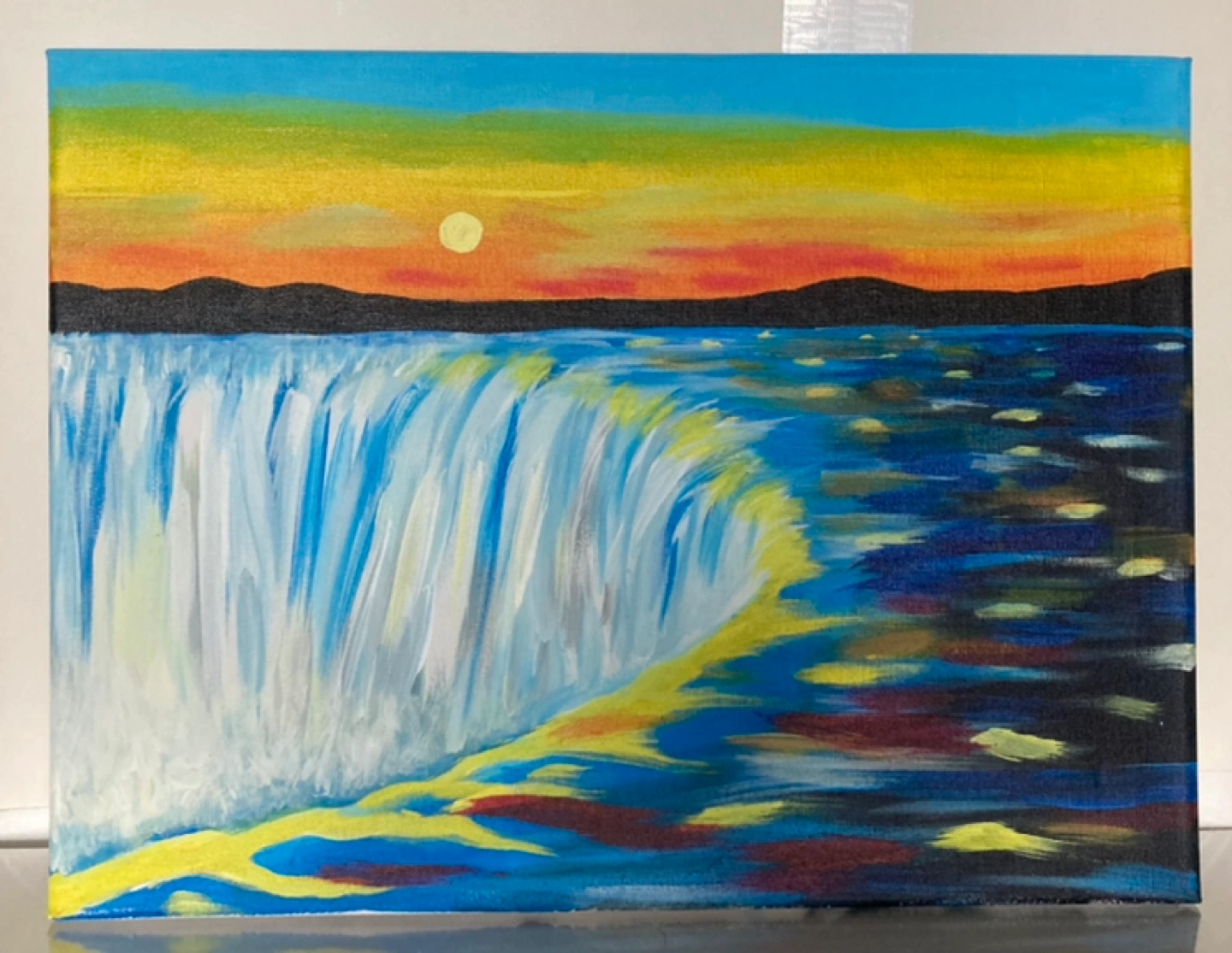 Acrylic painting on canvas depicting Niagara Falls. Vibrant colours used for the sky and water reflections. It's a lovely piece of wall art.