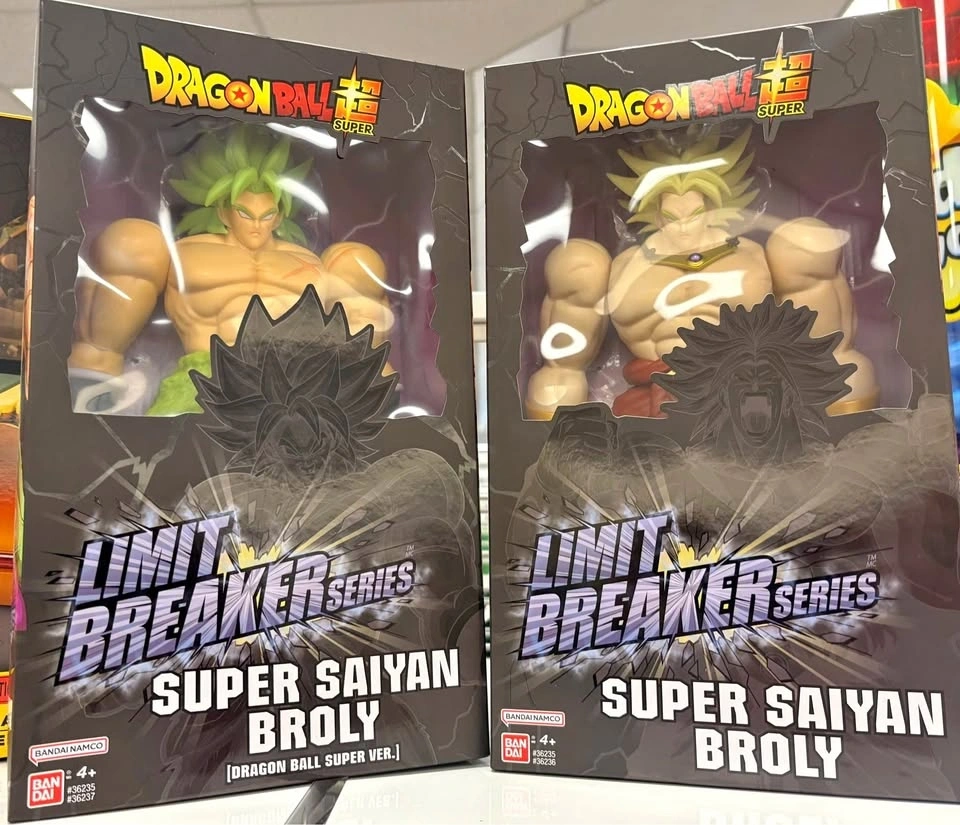 Awesome Dragon Ball Super figures! Two Bandai Namco Limit Breaker Series Super Saiyan Broly action figures. Both are new in original boxes. One is the Dragon Ball Super version with green hair. The other Super Saiyan Broly figure has yellow-green hair and a gold collar. Great for any fan or collector.