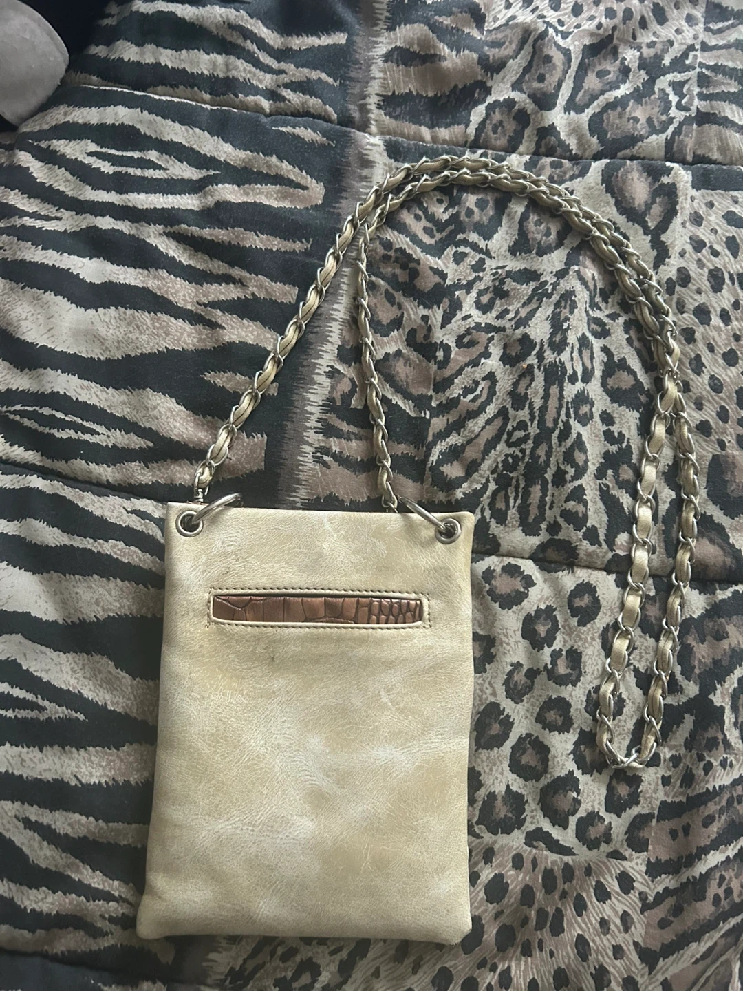 This stylish crossbody bag features intricate embellishments and a decorative fleur-de-lis design. It has a convenient pocket on the back. The metal chain strap adds a touch of flair.
