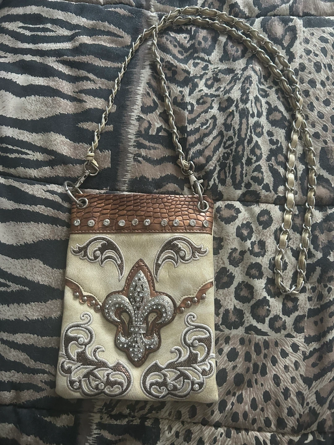 This stylish crossbody bag features intricate embellishments and a decorative fleur-de-lis design. It has a convenient pocket on the back. The metal chain strap adds a touch of flair.