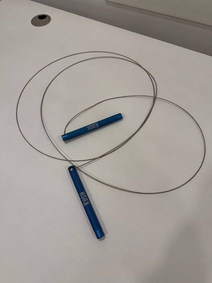 Selling a custom metal jump rope made from RPM Training. The handles are blue with custom text that says Kush. The rope is metal and made for speed, so it's not ideal for beginners.