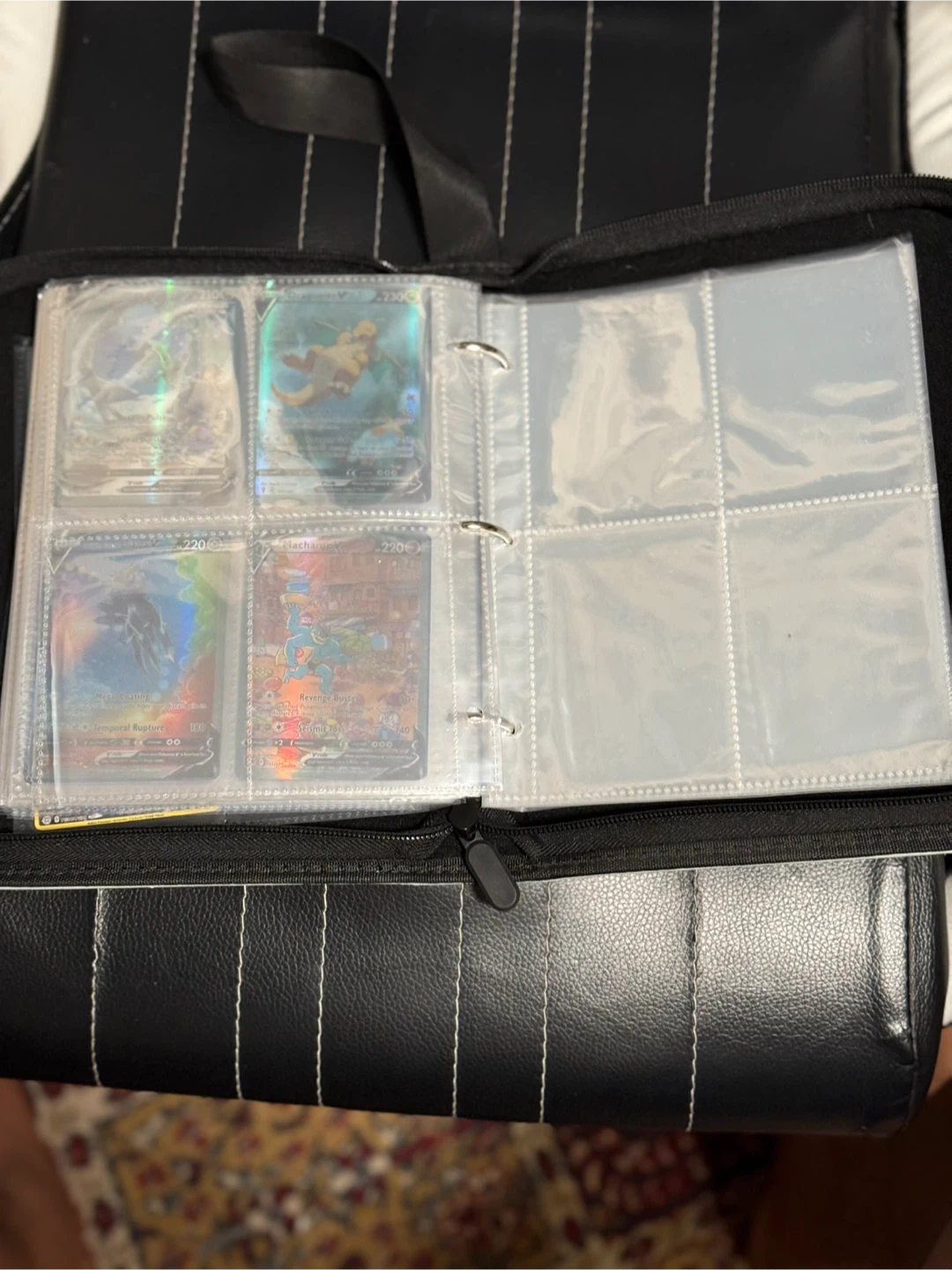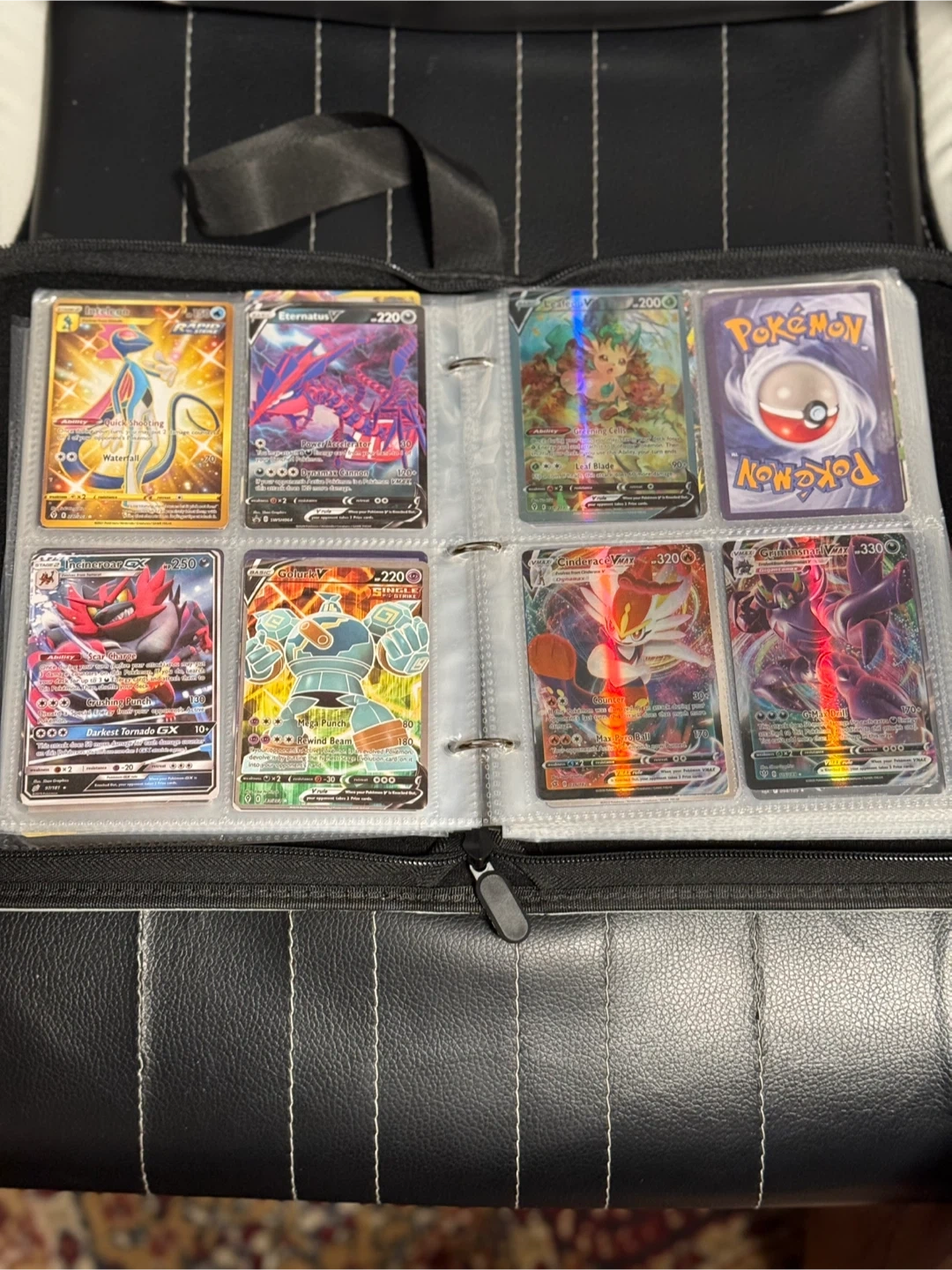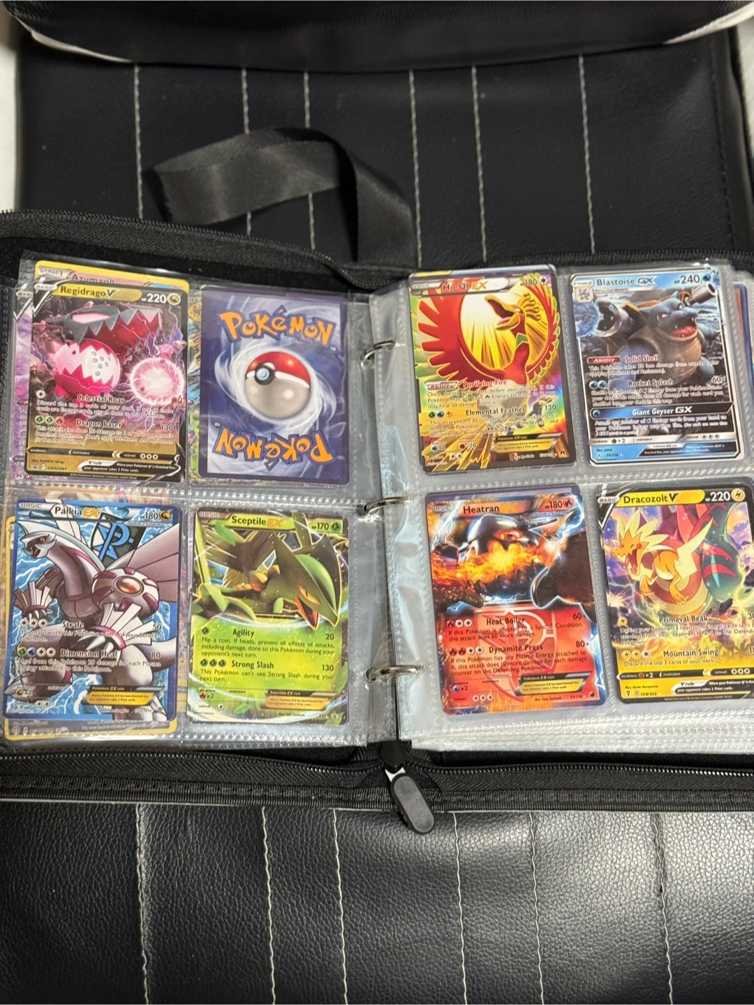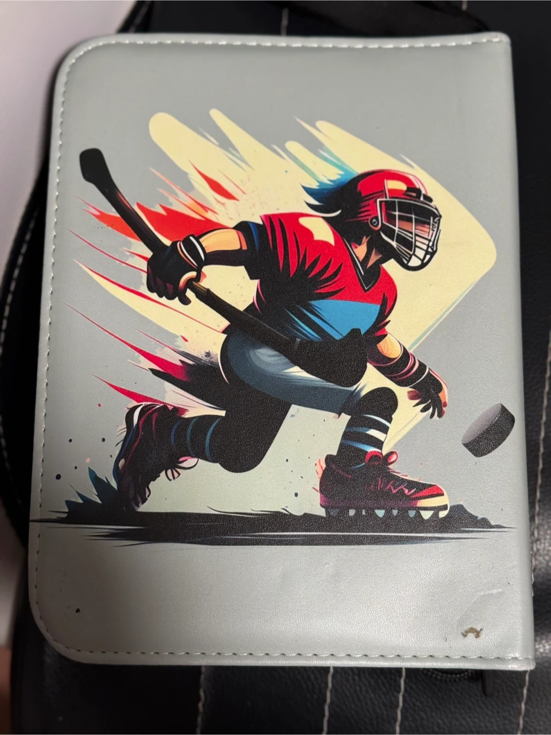 This binder holds a collection of Pokemon trading cards. It features a hockey-themed design on the cover. It's great for keeping your cards organized and protected. Buy As Is.