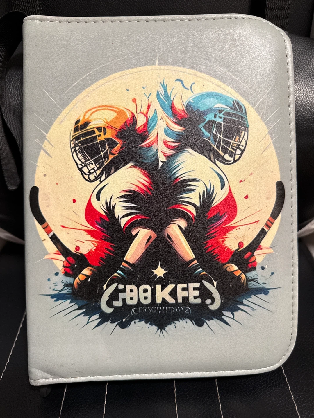 This binder holds a collection of Pokemon trading cards. It features a hockey-themed design on the cover. It's great for keeping your cards organized and protected. Buy As Is.